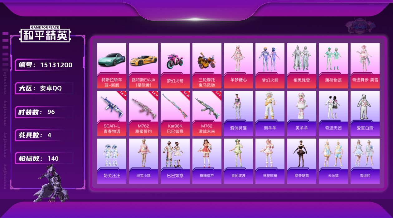 [15131200]可二次【店主推荐捡漏号!可直接换绑】 安卓 手Q-5粉装-4特效枪-4载具-1粉色飞行器-4.5w热力值-3王牌印记-96套装-140枪皮【热门品类】:粉装-梦幻火箭【粉色载具】:特斯拉Roadster(水滴蓝),路特斯EVIJA(星际黄),双人摩托-梦幻火箭,鬼马风驰【粉色套装】:粉装-梦幻火箭,粉装-相思残雪,粉装-薄荷物语,角色-奇迹舞步 美雪,角色-羊梦糖心【粉色枪皮等级】:SCAR-L-青春物语(七级),M762-甜蜜誓约(七级),M762-激战未来(一级),Kar98K-巳巳如意(四级)【粉色飞行器】:梦幻火箭飞行器