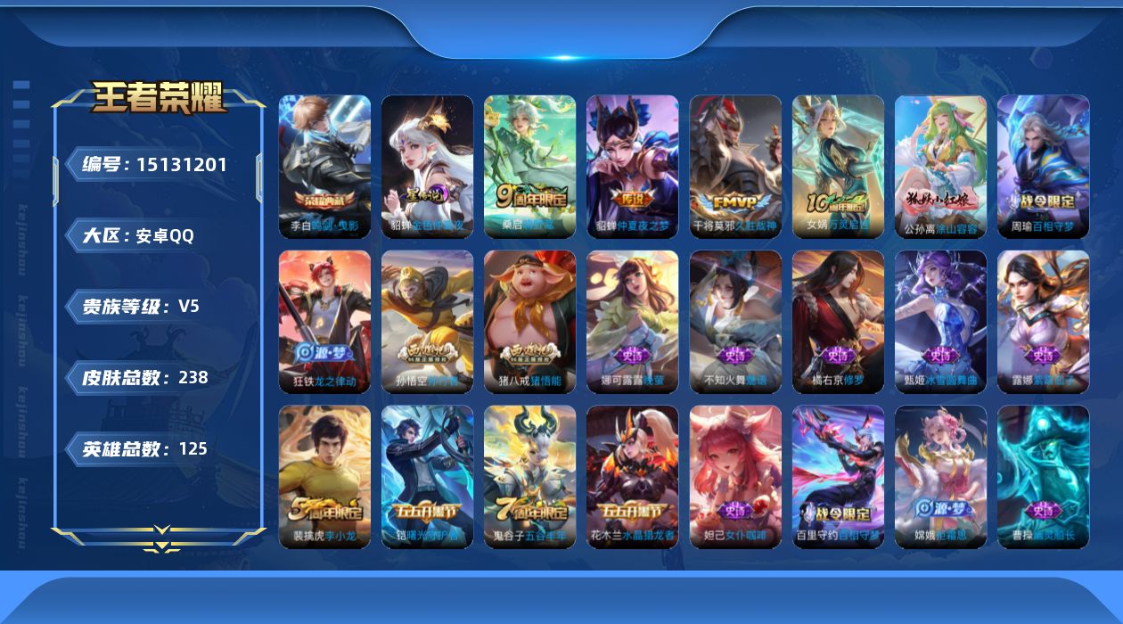 [15131201]【店主推荐捡漏号!可直接换绑】安卓Q-V5-最强王者段位-125英雄-238皮肤-1典藏-4传说-59史诗