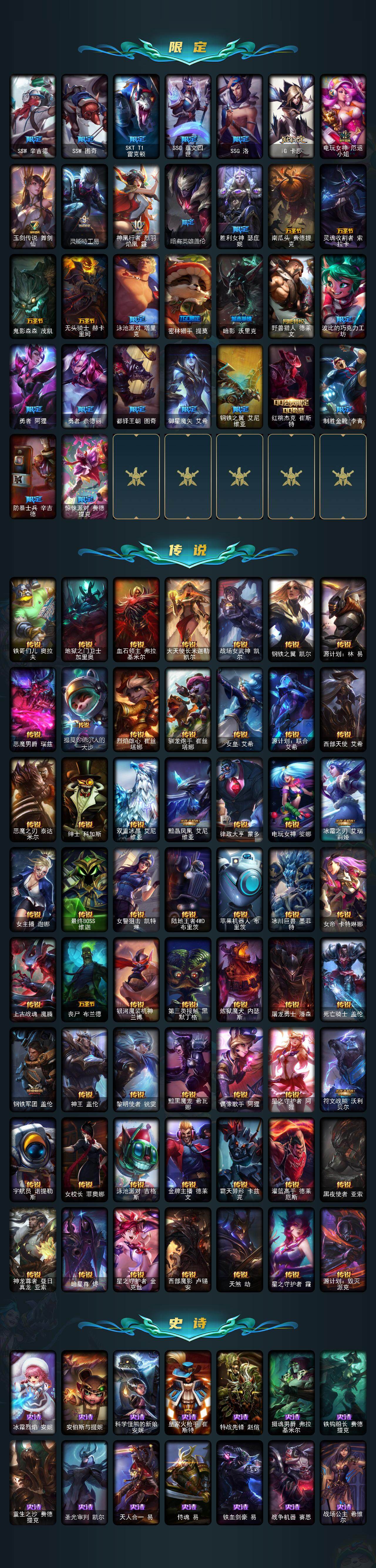 【限定皮肤】:哥特萝莉安妮,钢铁军团拉克丝,养蜂人辛吉德,送披萨的小姐姐希维尔,斩星魔剑易,冠军之血希瓦娜,Fnatic古拉加斯,Fnatic迦娜,Fnatic嘉文四世,Fnatic库奇,暗杀星蒙多,暗杀星慎,SKTT1贾克斯,SKTT1薇恩,SSW辛吉德,SSW图奇,SKTT1雷克顿,SSG嘉文四世,SSG洛,iG卡莎,电玩女神厄运小姐,玉剑传说舞剑仙,灵能特