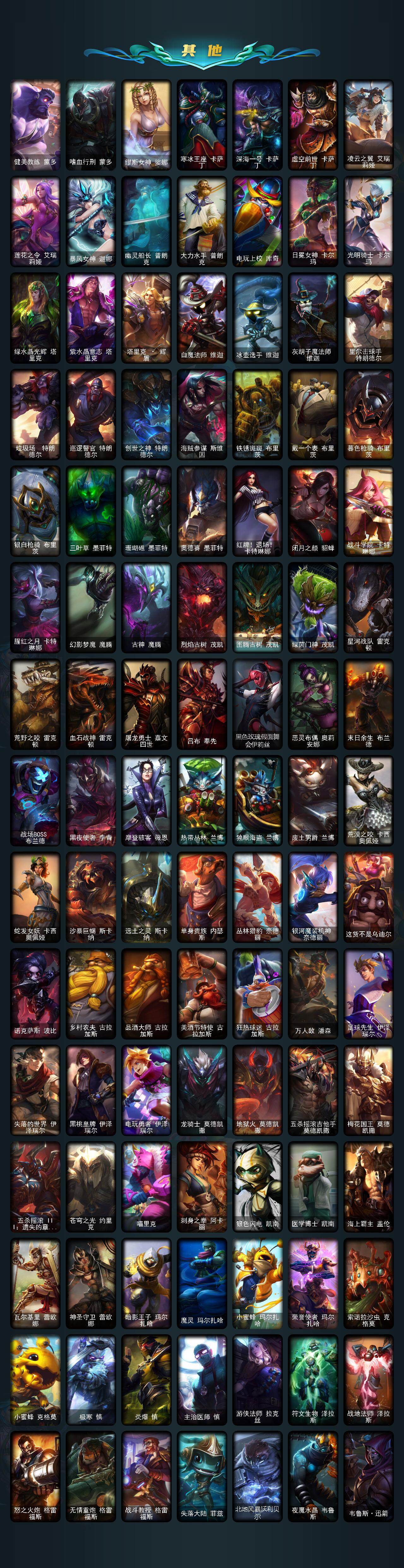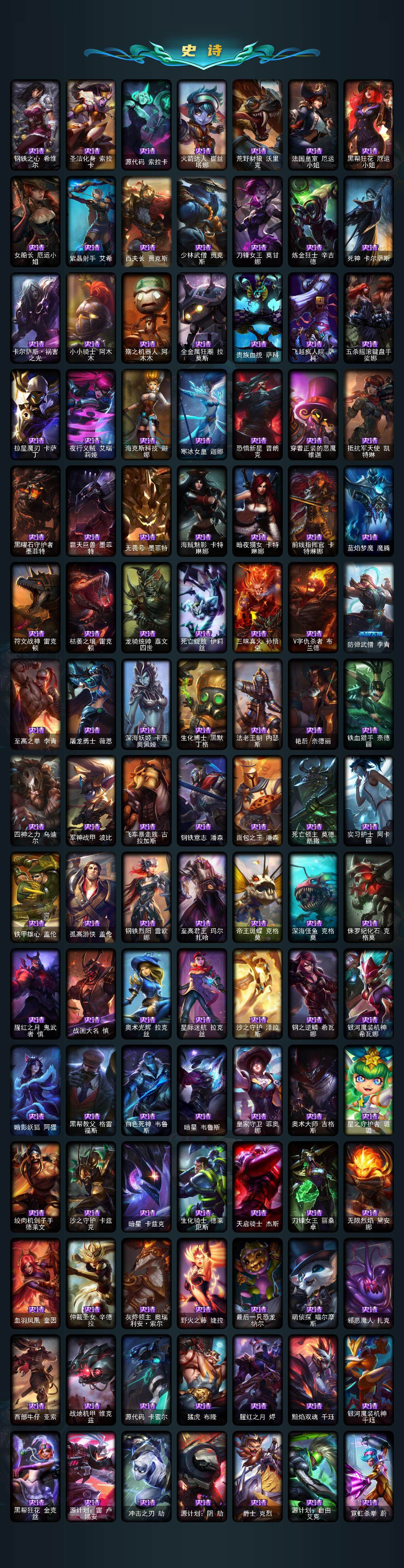 【冰雪限定】:幸福女神乐芙兰,持胡萝卜的雪人易,圣诞开心鬼提莫,圣诞精灵崔丝塔娜,胡桃夹子萨科,平安夜女神娑娜,英勇玩具兵普朗克,冬季仙境卡尔玛,邪恶圣诞老人维迦,夺命美人卡特琳娜,喜庆之树茂凯,雪默丁格,圣诞玩偶波比,圣诞老人古拉加斯,圣诞驯鹿克格莫,冰雪节辛吉德,冰雪女神辛德拉