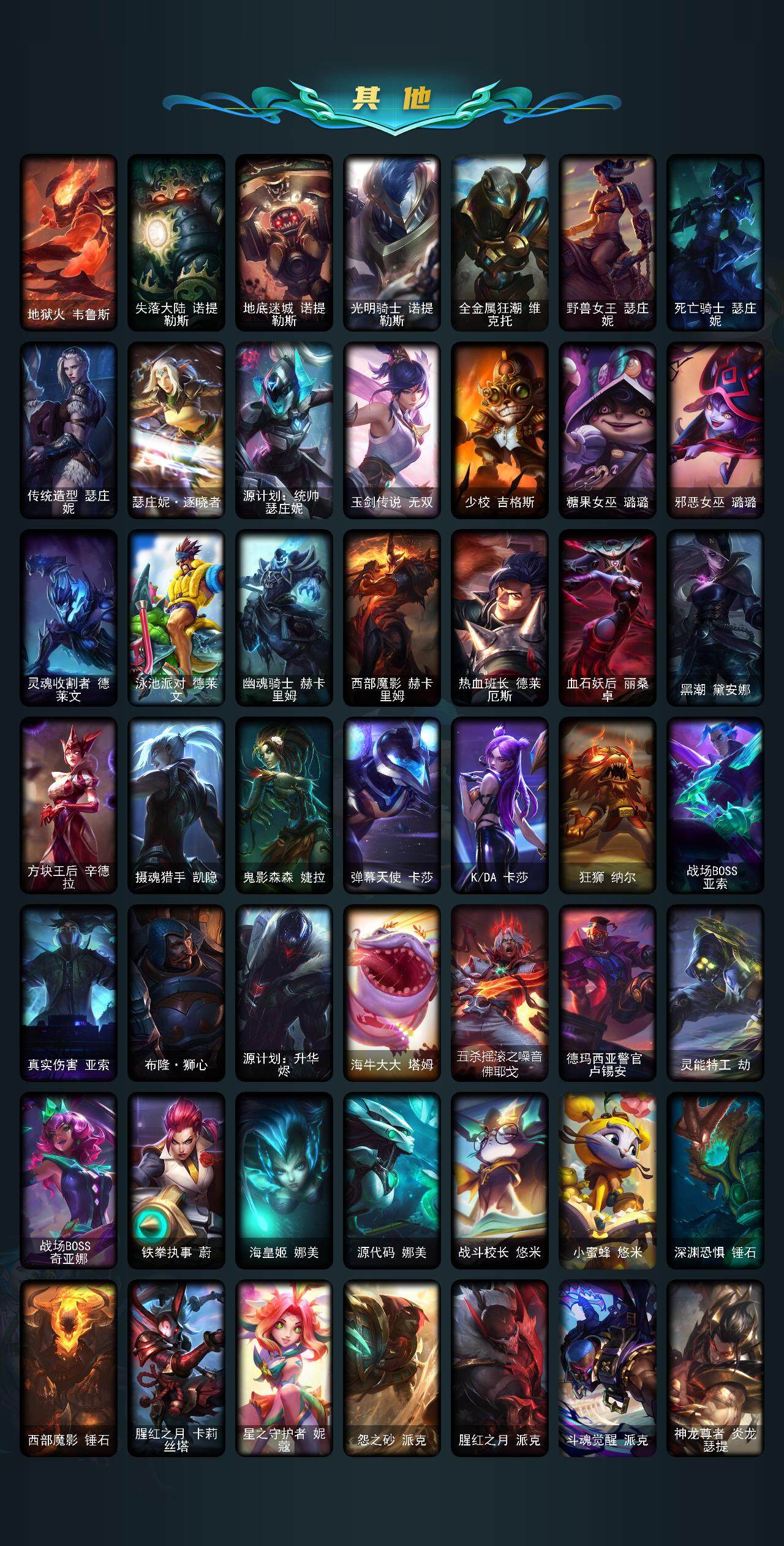 【神话皮肤】:十周年纪念安妮,十五周年纪念希维尔,暗星科加斯,神凰行者瑞羽圣凰艾尼维亚,灰烬骑士莫德凯撒,海克斯科技阿利斯塔,海克斯科技嘉文四世,海克斯科技雷克顿,海克斯科技魔腾,恐惧新星德莱厄斯,摄魂使者薇恩,新创战纪希维尔,至臻征服者贾克斯,至臻真实伤害赛娜,至臻真实伤害亚索,至臻KDA伊芙琳,至臻KDA伊芙琳2022,至臻灵魂莲华易,至臻魔女婕拉,至臻绒毛菲兹,至臻绒毛菲兹2022,至臻未来战士锤石,至臻未来战士锤石2022,至臻未来战士卢锡安,至臻腥红之月亚托克斯,至臻腥红之月亚托克斯2022,至臻源计划逆流塞拉斯,至臻源计划阴劫