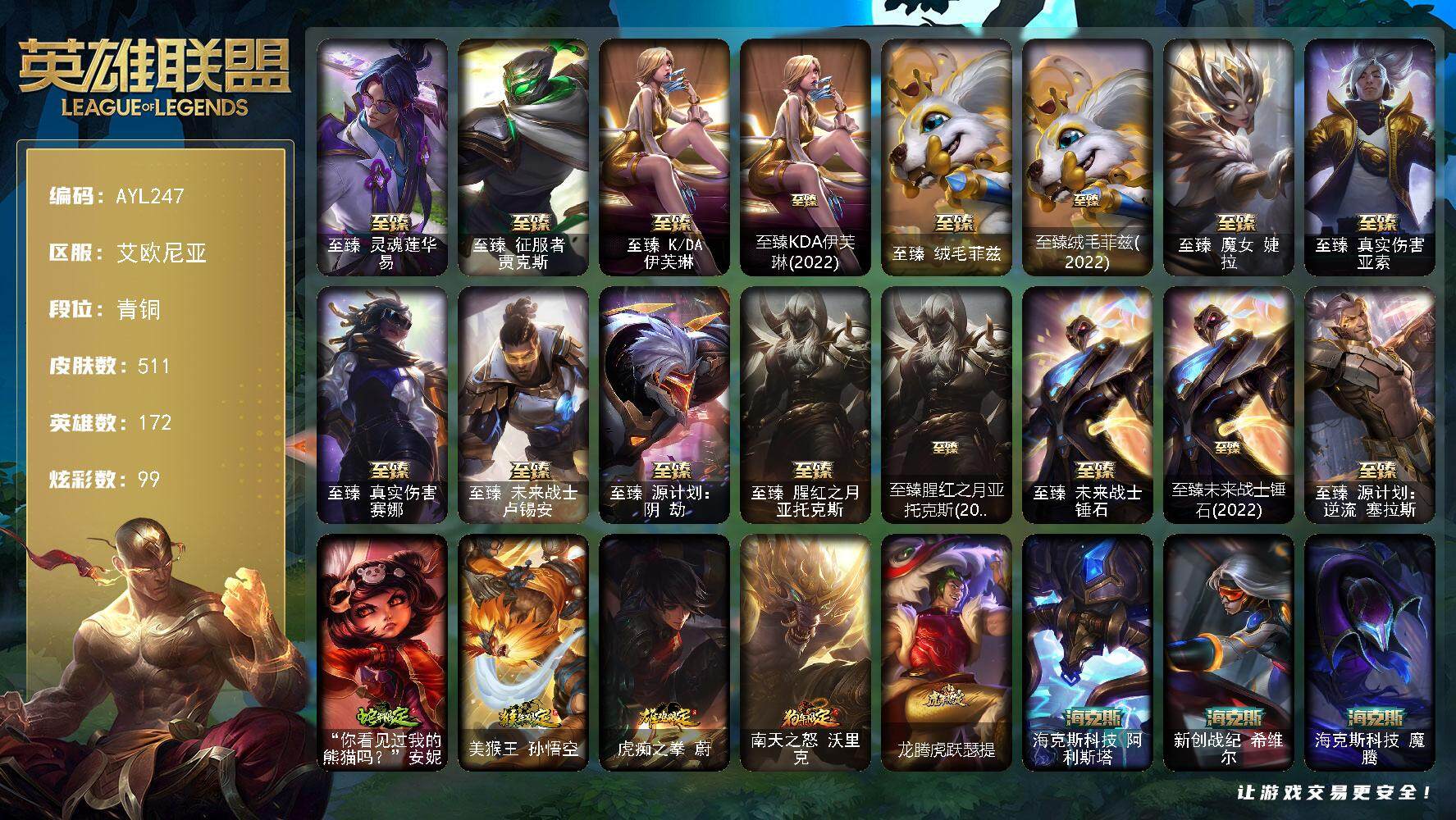 [15132404]可二次【特价出售/店主推荐】青铜段位-172英雄-511皮肤-99炫彩-0终极-28神话-66限定-56传说-128史诗 【至臻皮肤】:至臻灵魂莲华易,至臻征服者贾克斯,至臻KDA伊芙琳,至臻KDA伊芙琳(2022),至臻绒毛菲兹,至臻绒毛菲兹(2022),至臻魔女婕拉,至臻真实伤害亚索,至臻真实伤害赛娜,至臻未来战士卢锡安,至臻源计划阴劫,至臻腥红之月亚托克斯,至臻腥红之月亚托克斯(2022),至臻未来战士锤石,至臻未来战士锤石(2022),至臻源计划逆流塞拉斯 【臻彩皮肤】:冠军之箭艾希凯旋圣装,玉剑传说无极白虎,冠军之血希瓦娜凯旋圣装,霸天异形卡兹克掠空魅影 【年限皮肤】:你看见过我的熊猫吗安妮,美猴王孙悟空,虎痴之拳蔚,南天之怒沃里克,龙腾虎跃瑟提 【海克斯皮肤】:海克斯科技阿利斯塔,新创战纪希维尔,海克斯科技魔腾,海克斯科技雷克顿,海克斯科技嘉文四世,摄魂使者薇恩,恐惧新星德莱厄斯 【冰雪限定】:幸福女神乐芙兰,持胡萝卜的雪人易,圣诞开心鬼提莫,圣诞精灵崔丝塔娜,胡桃夹子萨科,平安夜女神娑娜,英勇玩具兵普朗克,冬季仙境卡尔玛,邪恶圣诞老人维迦,夺命美人卡特琳娜,喜庆之树茂凯,雪默丁格,圣诞玩偶波比,圣诞老人古拉加斯,圣诞驯鹿克格莫,冰雪节辛吉德,冰雪女神辛德拉 【神话皮肤】:十周年纪念安妮,十五周年纪念希维尔,暗星科加斯,神凰行者瑞羽圣凰艾尼维亚,灰烬骑士莫德凯撒,海克斯科技阿利斯塔,海克斯科技嘉文四世,海克斯科技雷克顿,海克斯科技魔腾,恐惧新星德莱厄斯,摄魂使者薇恩,新创战纪希维尔,至臻征服者贾克斯,至臻真实伤害赛娜,至臻真实伤害亚索,至臻KDA伊芙琳,至臻KDA伊芙琳2022,至臻灵魂莲华易,至臻魔女婕拉,至臻绒毛菲兹,至臻绒毛菲兹2022,至臻未来战士锤石,至臻未来战士锤石2022,至臻未来战士卢锡安,至臻腥红之月亚托克斯,至臻腥红之月亚托克斯2022,至臻源计划逆流塞拉斯,至臻源计划阴劫 【限定皮肤】:哥特萝莉安妮,钢铁军团拉克丝,养蜂人辛吉德,送披萨的小姐姐希维尔,斩星魔剑易,冠军之血希瓦娜,Fnatic古拉加斯,Fnatic迦娜,Fnatic嘉文四世,Fnatic库奇,暗杀星蒙多,暗杀星慎,SKTT1贾克斯,SKTT1薇恩,SSW辛吉德,SSW图奇,SKTT1雷克顿,SSG嘉文四世,SSG洛,iG卡莎,电玩女神厄运小姐,玉剑传说舞剑仙,灵能特