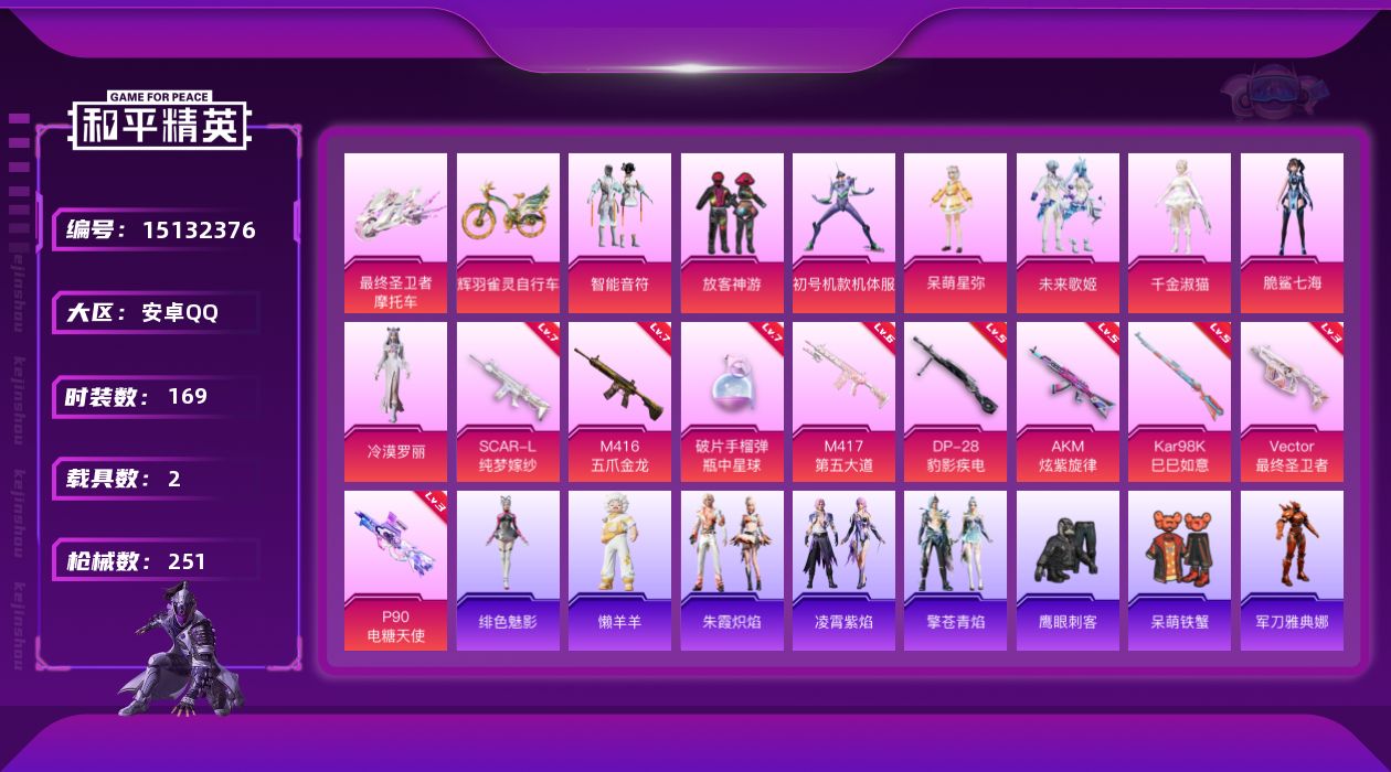 [15132376]【店主推荐捡漏号!可直接换绑】安卓 手Q-8粉装-9特效枪-2载具-3粉色飞行器-80076热力值-16王牌印记-169套装-251枪皮 【热门品类】:角色-军刀雅典娜,套装-龟仙人 【粉色套装】:粉装-智能音符,粉装-放客神游,角色-初号机款机体服,角色-呆萌星弥,粉装-未来歌姬,角色-千金淑猫,角色-脆鲨七海,角色-冷漠罗丽 【粉色枪皮等级】:AKM-炫紫旋律(五级),SCAR-L-纯梦嫁纱(七级),M416-五爪金龙(七级),Vector-最终圣卫者(三级),P90-电糖天使(三级),Kar98K-巳巳如意(五级),M417-第五大道(六级),DP-28-豹影疾电(五级),破片手榴弹-瓶中星球(七级) 【粉色载具】:最终圣卫者摩托车,辉羽雀灵自行车 【粉色枪皮】:AKM-炫紫旋律,SCAR-L-纯梦嫁纱,M416-五爪金龙,Vector-最终圣卫者,P90-电糖天使,Kar98K-巳巳如意,M417-第五大道,DP-28-豹影疾电,破片手榴弹-瓶中星球 【粉色飞行器】:雀灵庇佑飞行器,终晖之翼飞行器