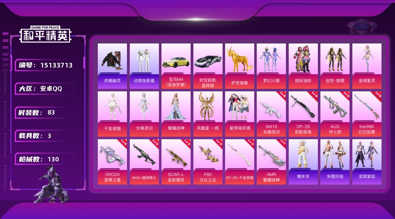 [15133713]特价急出!安卓 手Q-9粉装-10特效枪-3载具-9粉色飞行器-46128热力值-6王牌印记-83套装-130枪皮
