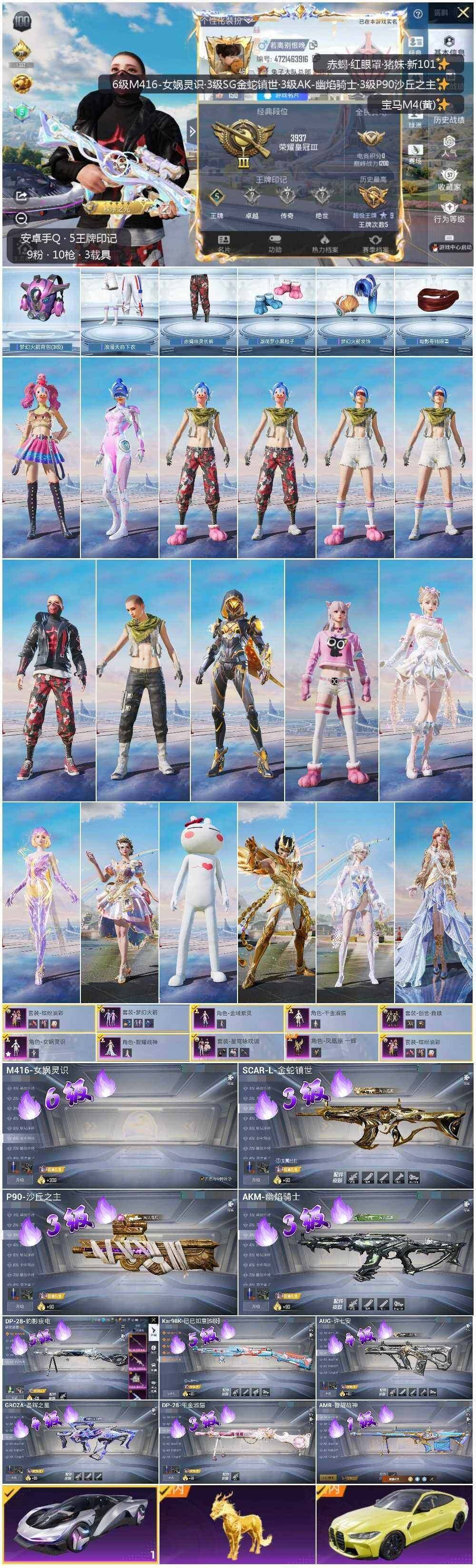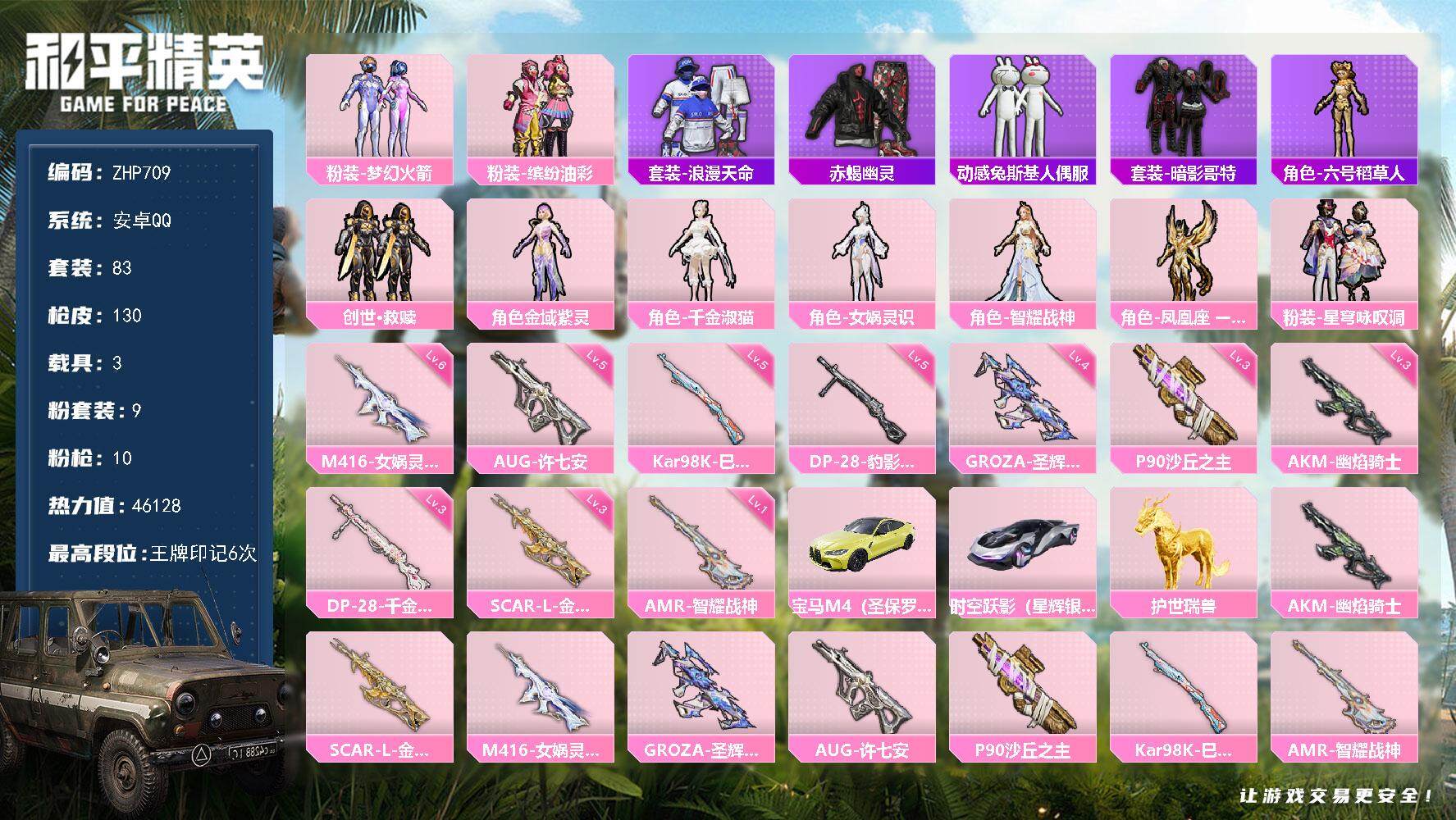 [15133713]特价急出!安卓 手Q-9粉装-10特效枪-3载具-9粉色飞行器-46128热力值-6王牌印记-83套装-130枪皮 【热门品类】:粉装-梦幻火箭,粉装-缤纷油彩,套装-浪漫天命,套装-赤蝎幽灵,套装-动感兔斯基人偶服,套装-暗影哥特,角色-六号稻草人 【粉色套装】:粉装-梦幻火箭,粉装-缤纷油彩,套装-创世·救赎,角色-金域紫灵,角色-千金淑猫,角色-女娲灵识,角色-智耀战神,角色-凤凰座 一辉,粉装-星穹咏叹调 【粉色枪皮等级】:AKM-幽焰骑士(三级),SCAR-L-金蛇镇世(三级),M416-女娲灵识(六级),GROZA-圣辉之星(四级),AUG-许七安(五级),P90-沙丘之主(三级),Kar98K-巳巳如意(五级),AMR-智耀战神(一级),DP-28-千金淑猫(三级),DP-28-豹影疾电(五级) 【粉色载具】:宝马M4(圣保罗黄),时空跃影(星辉银),护世瑞兽 【粉色枪皮】:AKM-幽焰骑士,SCAR-L-金蛇镇世,M416-女娲灵识,GROZA-圣辉之星,AUG-许七安,P90-沙丘之主,Kar98K-巳巳如意,AMR-智耀战神,DP-28-千金淑猫,DP-28-豹影疾电 【粉色飞行器】:梦幻火箭飞行器,齐天大圣飞行器,镜域双华-灵镜之阶,幽焰列车飞行器,脆鲨七海飞行器,动力核心飞行器,万象金身飞行器,圣域金龙飞行器 【粉色降落伞】:沙丘之主降落伞,幽焰骑士降落伞,千金淑猫降落伞,临安公主降落伞,金蛇镇世降落伞,鬼刀降落伞,戏水时光降落伞,圣域龙灵降落伞,圣辉之星降落伞,幻星舰长降落伞,宁雨蝶降落伞,极意拳锋降落伞 【稀有套装】:套装-绒宝小鹅,套装-巳巳如意,套装-糖糖葫芦,套装-青团波波,套装-棉花软糖,角色-都市丽猫,角色-摩登魅猫,角色-许七安,角色-临安公主,套装-燕燕于飞,套装-鱼渊荷华,角色-海琴烟,角色-糖霜甜心,套装-白辉玉蕊,角色-幽秘之星,套装-粉恋花,套装-紫幽梦,套装-蓝冰羽,角色-猎影月神,角色-六号稻草人,套装-星渊小夜曲,套装-极速光影,套装-云朵鹅,套装-雪绒豹,角色-夜瞳黯灵,套装-朱霞炽焰,套装-凌霄紫焰,玩偶服-懒羊羊,套装-炫彩糖果 【稀有枪皮】:AUG-冰晶雪宝,M16A4-千金淑猫,SCAR-L-炫彩节奏,SCAR-L-黄金龙骨,M416-红色方程式,AUG-耀粉歌者,AUG-金蛇镇世,AUG-绝对恒星