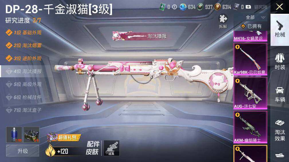 【粉色枪皮等级】:AKM-幽焰骑士(三级),SCAR-L-金蛇镇世(三级),M416-女娲灵识(六级),GROZA-圣辉之星(四级),AUG-许七安(五级),P90-沙丘之主(三级),Kar98K-巳巳如意(五级),AMR-智耀战神(一级),DP-28-千金淑猫(三级),DP-28-豹影疾电(五级)