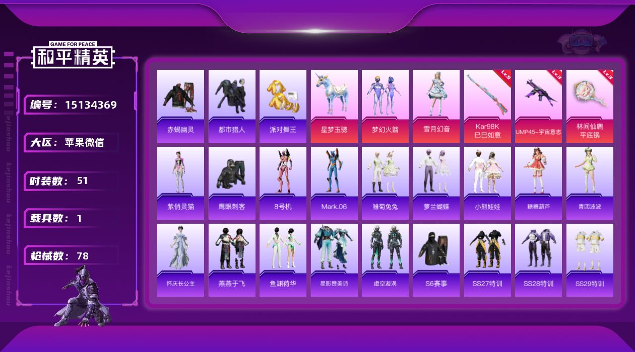 [15134369]【可二次 店主推荐捡漏号!可直接换绑】苹果 微信-2粉装-3特效枪-1载具-0粉色飞行器-23674热力值-3王牌印记-51套装-78枪皮 【热门品类】:粉装-梦幻火箭,套装-赤蝎幽灵,套装-都市猎人,套装-派对舞王,角色-8号机,角色-Mark.06 【粉色套装】:粉装-梦幻火箭,粉装-雪月幻音 【粉色枪皮等级】:UMP45-宇宙意志(三级),Kar98K-巳巳如意(五级),平底锅-林间仙鹿(三级) 【粉色载具】:星梦玉骢 【粉色枪皮】:UMP45-宇宙意志,Kar98K-巳巳如意,平底锅-林间仙鹿 【粉色降落伞】:梦幻火箭降落伞,沙丘之主降落伞,星梦奇缘降落伞,初号机 觉醒Ver.降落伞,金丰海韵降落伞 【稀有套装】:套装-雏菊兔兔,套装-萝兰蝴蝶,套装-小熊娃娃,套装-糖糖葫芦,套装-青团波波,角色-怀庆长公主,套装-燕燕于飞,套装-鱼渊荷华,套装-星影赞美诗,套装-虚空漩涡,角色-紫俏灵猫 【稀有枪皮】:AKM-影袭,SCAR-L-炫彩节奏,GROZA-影袭,AUG-天降萌叽,AUG-甜蜜菠萝,AUG-耀粉歌者,QBZ-绒兔团圆,M762-天降萌叽,G36C-镜域双华,UZI-影袭,UMP45-生命誓言,汤姆逊-环太平洋,P90-巳巳如意,Kar98K-影袭,Kar98K-梦幻火箭,Kar98K-星穹咏叹调,M24-影袭,Mini14-梦幻火箭,Mini14-炫彩节奏,Mini14-生命誓言,S686-未来战士,S686-巳巳如意,MG3-幻世战舞者,撬棍-沙丘之主权杖,破片手榴弹-巳巳如意 【其他套装】:套装-S6赛事,套装-SS27特训,套装-SS28特训,套装-SS29特训,套装-决胜时刻,套装-春日漫步,套装-活力之心,套装-猛禽,套装-破晓情侣,套装-竞技名士,套装-绮丽涂鸦,套装-鹤鸣,套装-鹰眼刺客,套装-冰冻风暴,套装-漫步者,套装-赤蝎幽灵,套装-纯真浪花,套装-热情海星,角色-粉雾星云,角色-极地流光,角色-8号机,角色-Mark.06,套装-湖畔霞光,套装-粉日山川 【稀有头盔】:梦幻火箭头盔(3级),梦幻火箭头盔(2级),梦幻火箭头盔(1级) 【稀有背包】:梦幻火箭背包(3级),梦幻火箭背包(2级),梦幻火箭背包(1级) 【营地ID】:403287528
