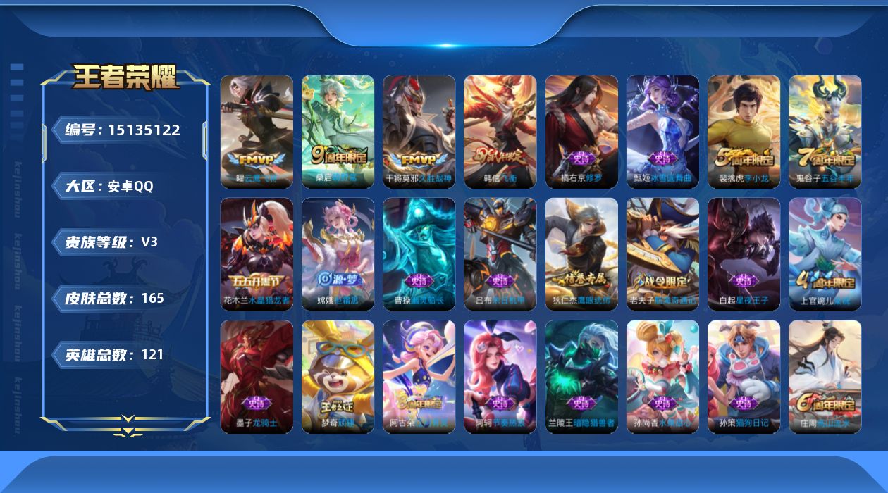 [15135122]暑期末清货/特价急出/永久包赔/商品详情看图安卓Q-V5-至尊星耀IV段位-121英雄-165皮肤-3传说-33史诗【传说皮肤】:干将莫邪久胜战神,曜云鹰飞将,桑启鸣野蒿【年限皮肤】:韩信飞衡【战令限定】:墨子神迹守卫,老夫子航海奇遇记