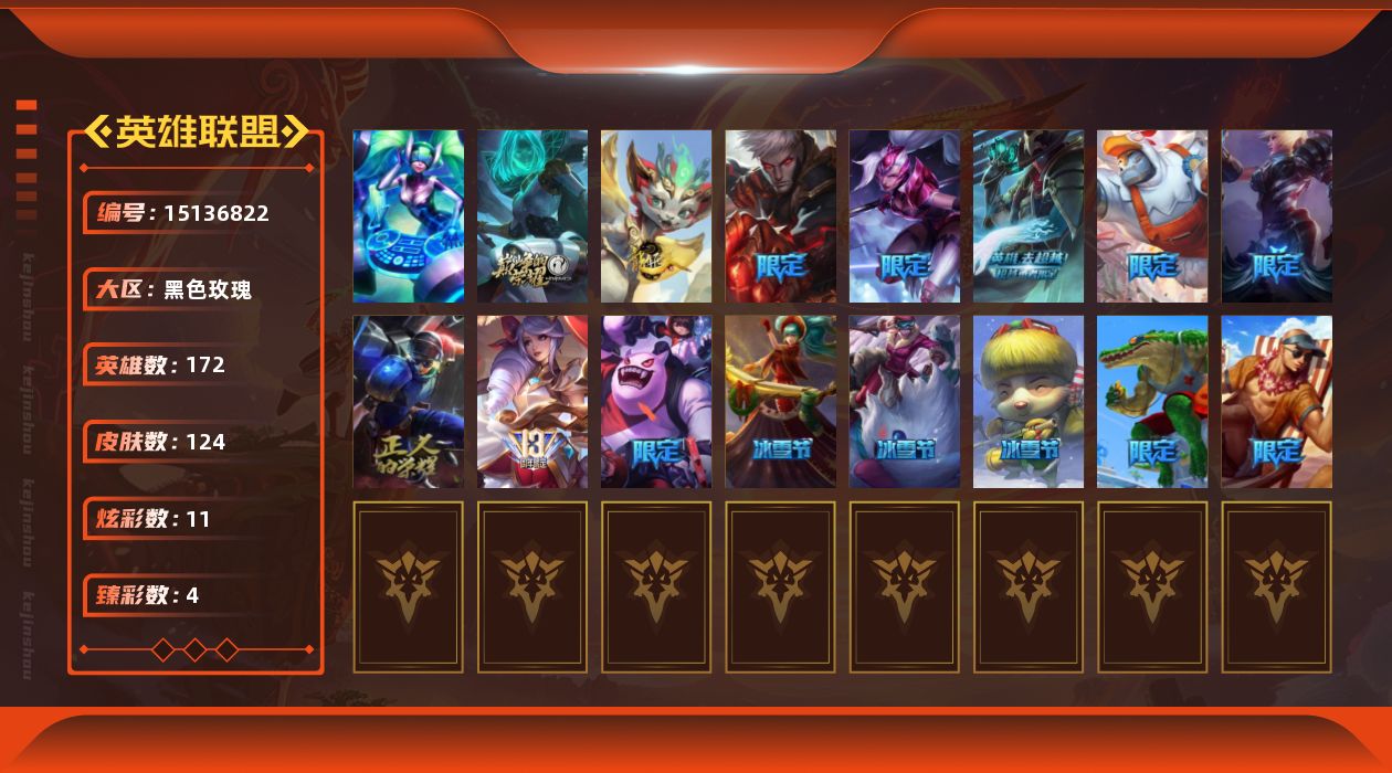 [15136822]【特价出售/店主推荐】黑铁段位-172英雄-124皮肤-11炫彩-1终极-2神话-16限定-15传说-30史诗