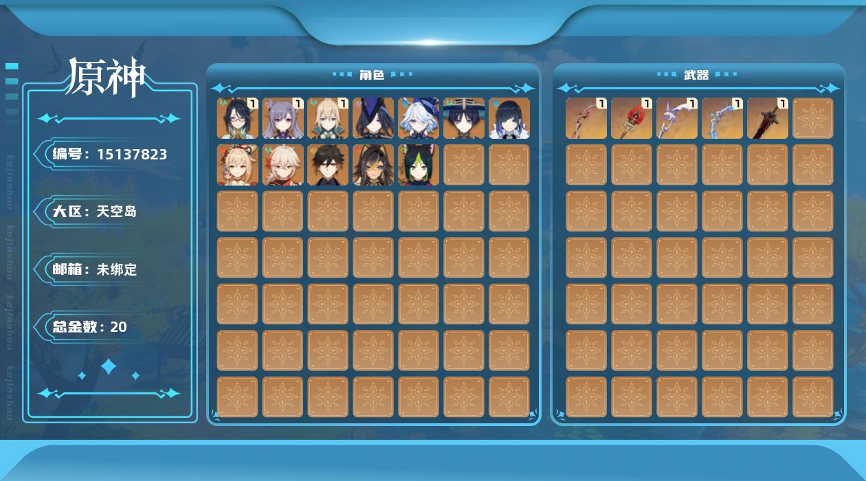 0命克洛琳德,1命闲云,0命芙宁娜,0命迪希雅,0命流浪者,0命提纳里,0命夜兰,0命枫原万叶,0命钟离,0命宵宫,1命刻晴,1命琴,精1最初的大魔术,精1冬极白星,精1护摩之杖,精1阿莫斯之弓,精1狼的末路