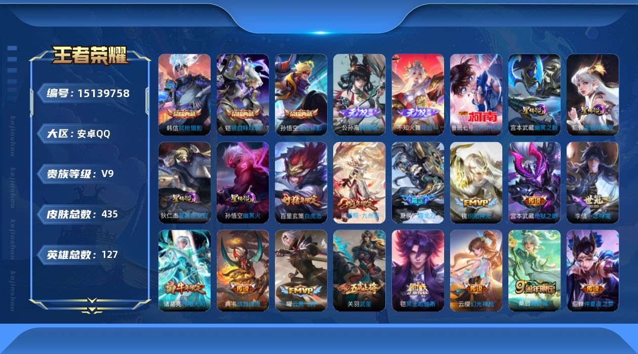 [15139758]安卓Q-V9-最强王者段位-127英雄-434皮肤-3典藏皮肤-2无双-1珍品传说-4星传-32传说-135史诗