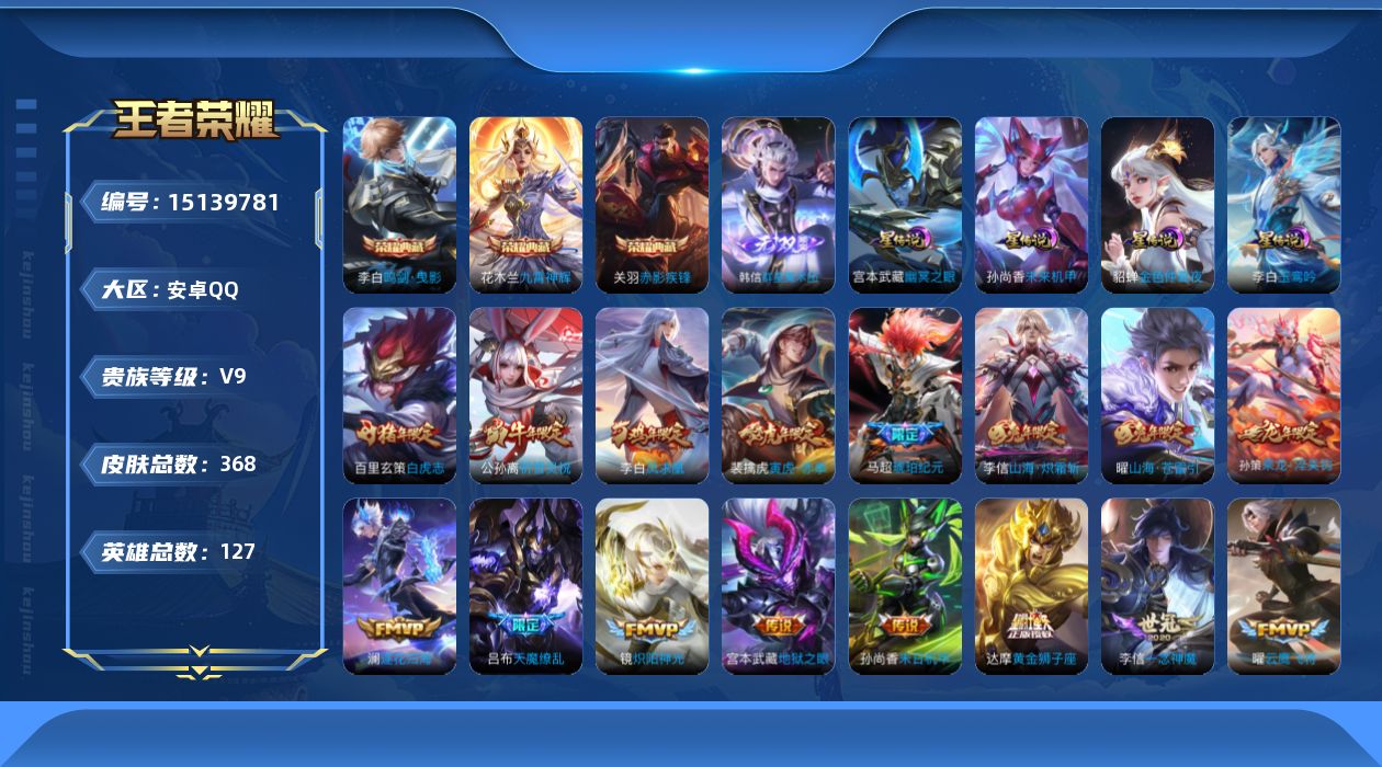 [15139781]【店主推荐捡漏号!可直接换绑】安卓Q-V9-最强王者段位-127英雄-368皮肤-3典藏皮肤-1无双-34传说-111史诗