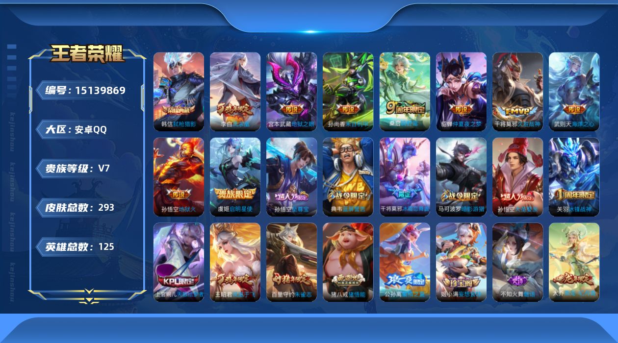 [15139869]【暑期末清货/特价急出/永久包赔/商品详情看图】:安卓Q-V7-至尊星耀I段位-125英雄-293皮肤-2典藏-9传说-79史诗