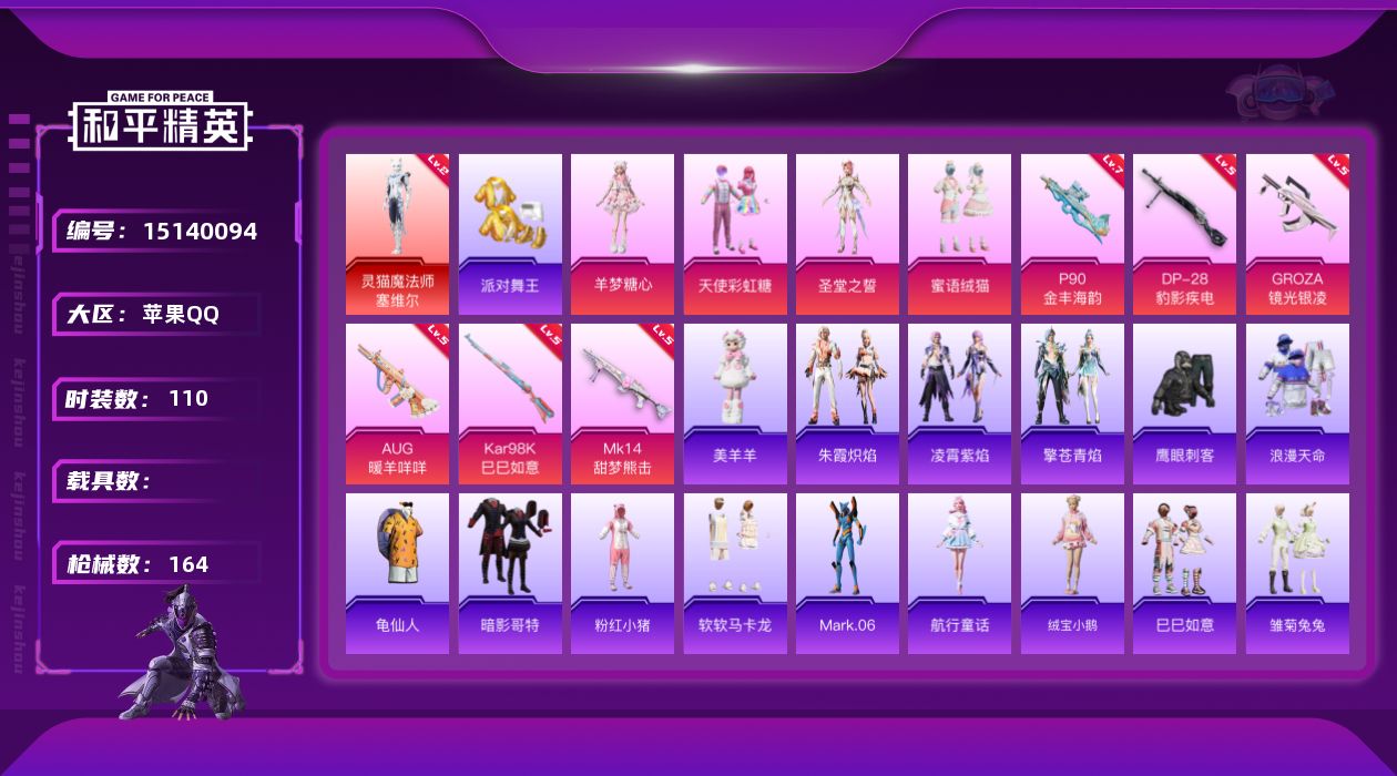 [15140094]素材身法号/地铁满天赋【特价急出/详情看图】:苹果 手Q-1神装-4粉装-6特效枪-4.7w热力值-9王牌印记-110套装-164枪皮【红色神装等级】:灵猫魔法师-塞维尔(二级)【热门品类】:套装-浪漫天命,套装-派对舞王,套装-龟仙人,套装-暗影哥特,套装-粉红小猪,套装-软软马卡龙,角色-Mark.06【粉色套装】:粉装-天使彩虹糖,角色-圣堂之誓,粉装-蜜语绒猫,角色-羊梦糖心【粉色枪皮等级】:GROZA-镜光银凌(五级),AUG-暖羊咩咩(五级),P90-金丰海韵(七级),Kar98K-巳巳如意(五级),Mk14-甜梦熊击(五级),DP-28-豹影疾电(五级)