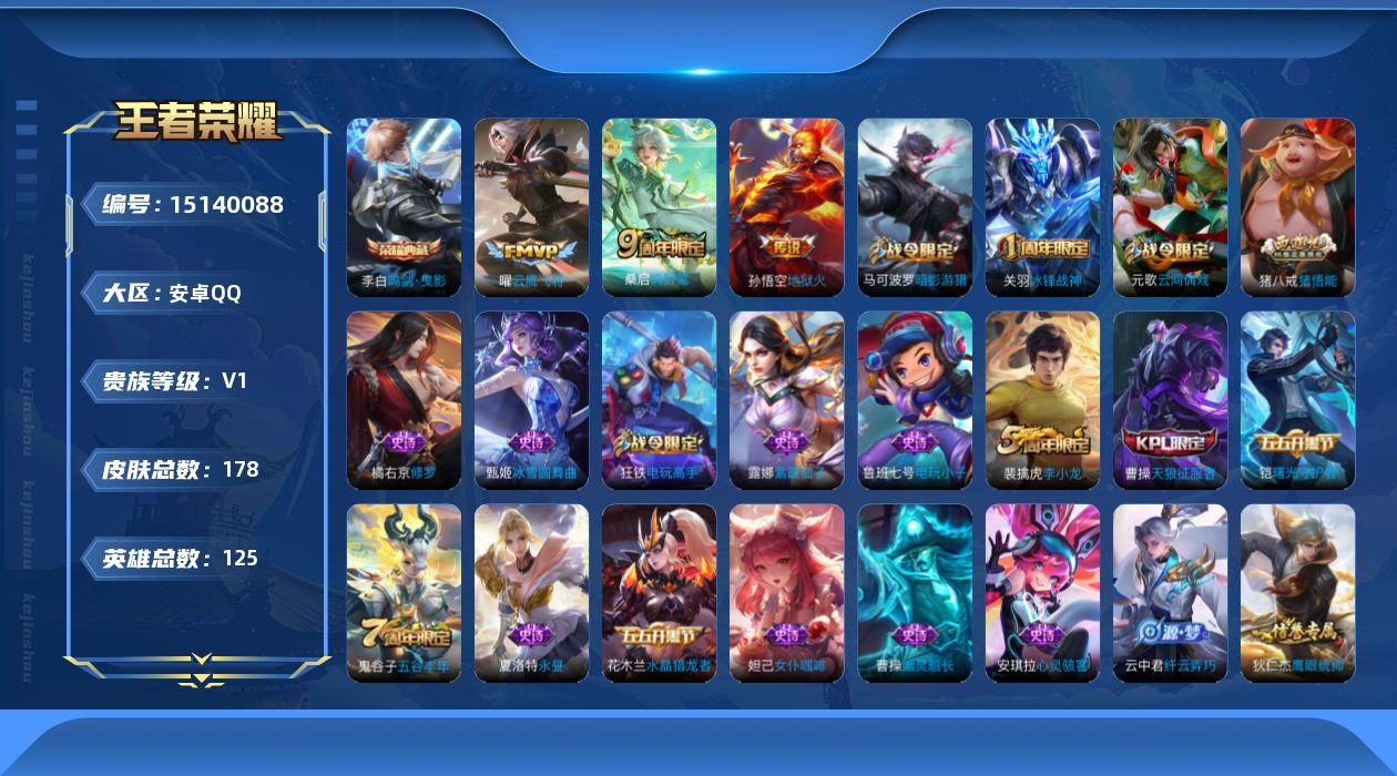 [15140088]【特价急出/详情看图】:安卓Q-V0-尊贵铂金I段位-123英雄-173皮肤-1典藏-3传说-54史诗 【荣耀典藏】:李白鸣剑曳影 【传说皮肤】:桑启鸣野蒿,曜云鹰飞将,孙悟空地狱火 【限定皮肤】:姜子牙天穹之誓,狄仁杰阴阳师,赵云皇家上将,墨子神迹守卫,庄周高山流水,高渐离玩趣恶龙,钟无艳王者之锤,元歌云间偶戏,夏侯惇朔风刀,曹操天狼征服者,马可波罗暗影游猎,狄仁杰魔术师,狄仁杰万华元夜,达摩星际陆战队,达摩沙漠行僧,项羽海滩派对,老夫子醍醐杖,老夫子航海奇遇记,关羽冰锋战神,程咬金演武夺筹,王昭君午后时光,兰陵王金庭之子,亚瑟潮玩骑士王,后羿圣弓游侠,李元芳银河之约,李元芳云中旅人,钟馗驱傩正仪,干将莫邪真爱魔法,雅典娜黎明之约,蔡文姬繁星吟游,太乙真人华丽摇滚,鬼谷子原初探秘者,鬼谷子五谷丰年,苏烈千军破阵,百里玄策原初追逐者,弈星混沌棋,梦奇顽趣,沈梦溪星空之诺,沈梦溪大漠名商,明世隐疑决卦,裴擒虎李小龙,裴擒虎擒涛扼浪,狂铁电玩高手,米莱狄胡桃异想国,云中君纤云弄巧,盾山御銮,猪八戒西部大镖客,猪八戒猪悟能,上官婉儿梁祝,鲁班大师探海日志,桑启海盐诗旅,艾琳女武神,阿古朵江河有灵,张良古海寻踪,鬼谷子天穹祈灯,刘邦剑破天穹 【赛季限定】:夏侯惇朔风刀,狄仁杰万华元夜,达摩沙漠行僧,老夫子醍醐杖,程咬金演武夺筹,兰陵王金庭之子,张良古海寻踪,李元芳云中旅人,钟馗驱傩正仪,雅典娜黎明之约,鬼谷子原初探秘者,苏烈千军破阵,百里玄策原初追逐者,弈星混沌棋,梦奇顽趣,沈梦溪大漠名商,明世隐疑决卦,裴擒虎擒涛扼浪,盾山御銮,鲁班大师探海日志,桑启海盐诗旅,鬼谷子天穹祈灯,刘邦剑破天穹,姜子牙天穹之誓 【战令限定】:墨子神迹守卫,元歌云间偶戏,马可波罗暗影游猎,达摩星际陆战队,老夫子航海奇遇记,王昭君午后时光,亚瑟潮玩骑士王,后羿圣弓游侠,李元芳银河之约,干将莫邪真爱魔法,沈梦溪星空之诺,狂铁电玩高手,米莱狄胡桃异想国,猪八戒西部大镖客 【史诗皮肤】:鲁班七号电玩小子,露娜紫霞仙子,钟无艳王者之锤,赵云皇家上将,貂蝉圣诞恋歌,甄姬冰雪圆舞曲,王昭君偶像歌手,狄仁杰魔术师,廉颇地狱岩魂,宫本武藏鬼剑武藏,孙尚香水果甜心,妲己魅力维加斯,妲己女仆咖啡,墨子龙骑士,墨子金属风暴,吕布圣诞狂欢,曹操幽灵船长,张飞乱世虎臣,关羽冰锋战神,花木兰水晶猎龙者,夏侯惇乘风破浪,小乔缤