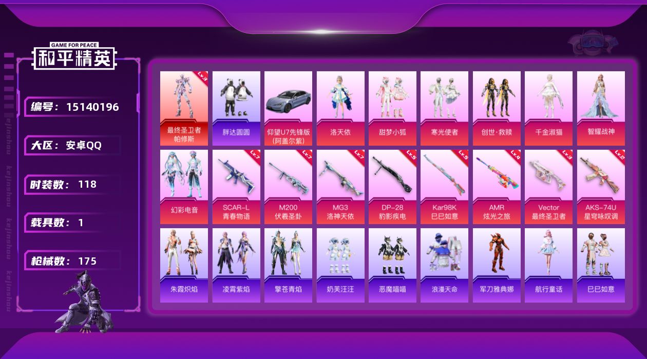 [15140196]素材身法号【特价急出/详情看图】:安卓 手Q-1神装-7粉装-8特效枪-1载具-2粉色飞行器-6w热力值-11王牌印记-118套装-175枪皮【红色神装等级】:最终圣卫者-帕修斯(三级)【热门品类】:套装-浪漫天命,角色-军刀雅典娜,套装-胖达圆圆【粉色载具】:仰望U7(阿盖尔紫)【粉色套装】:角色-洛天依,粉装-甜梦小狐,粉装-寒光使者,套装-创世·救赎,角色-千金淑猫,角色-智耀战神,粉装-幻彩电音【粉色枪皮等级】:SCAR-L-青春物语(七级),Vector-最终圣卫者(三级),AKS-74U-星穹咏叹调(二级),Kar98K-巳巳如意(五级),AMR-炫光之旅(四级),M200-伏羲圣卦(七级),DP-28-豹影疾电(五级),MG3-洛神天依(七级)【粉色飞行器】:天之羽翼飞行器,终晖之翼飞行器