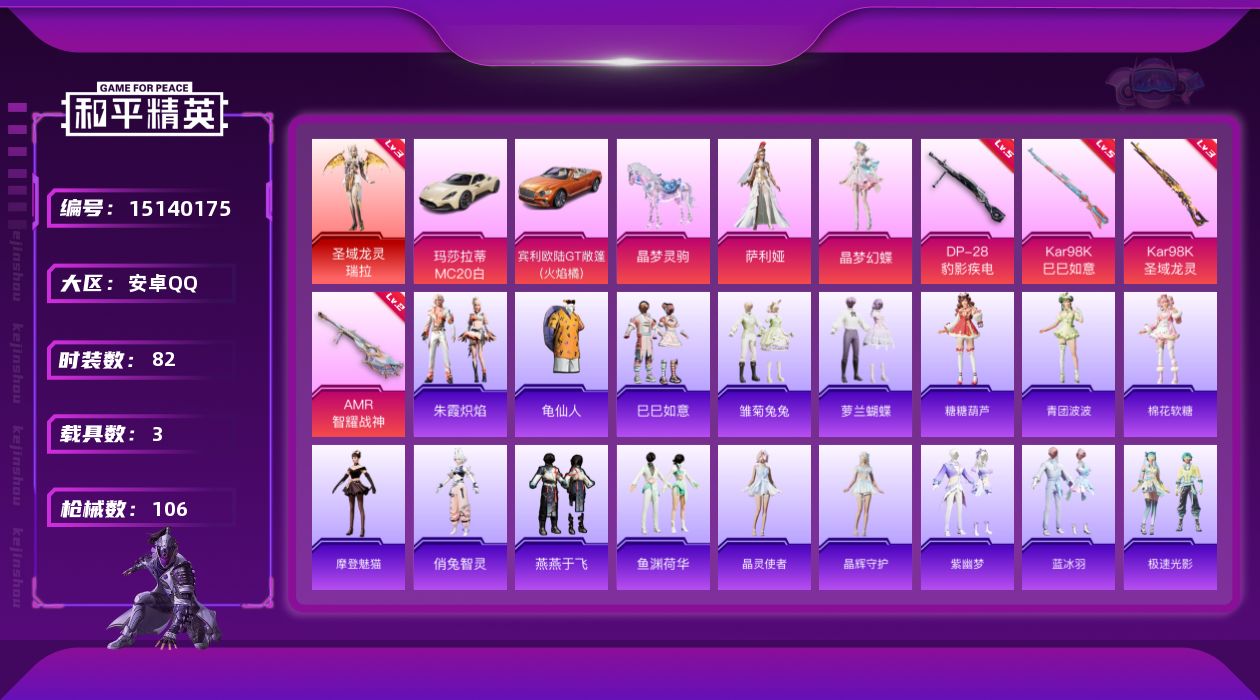 [15140175]素材身法号/璀璨碎片1888【特价急出/详情看图】:安卓 手Q-1神装-2粉装-4特效枪-3载具-1粉色飞行器-3.4w热力值-8王牌印记-82套装-106枪皮【红色神装等级】:圣域龙灵-瑞拉(三级)【热门品类】:套装-龟仙人【粉色载具】:玛莎拉蒂MC20(星石白),宾利欧陆GT敞篷(火焰橘),晶梦灵驹【粉色套装】:角色-萨利娅,角色-晶梦幻蝶【粉色枪皮等级】:Kar98K-巳巳如意(五级),Kar98K-圣域龙灵(三级),AMR-智耀战神(二级),DP-28-豹影疾电(五级)【粉色飞行器】:圣域金龙飞行器
