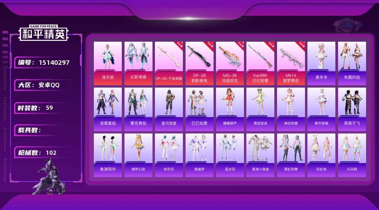 [15140297]地铁满天赋【特价急出/详情看图】:安卓 手Q-2粉装-5特效枪-2.9w热力值-5王牌印记-59套装-102枪皮【热门品类】:套装-星河浪客【粉色套装】:角色-洛天依,粉装-幻彩电音【粉色枪皮等级】:Kar98K-巳巳如意(五级),Mk14-甜梦熊击(五级),DP-28-千金淑猫(六级),DP-28-豹影疾电(五级),MG-36-沧焰双生(五级)