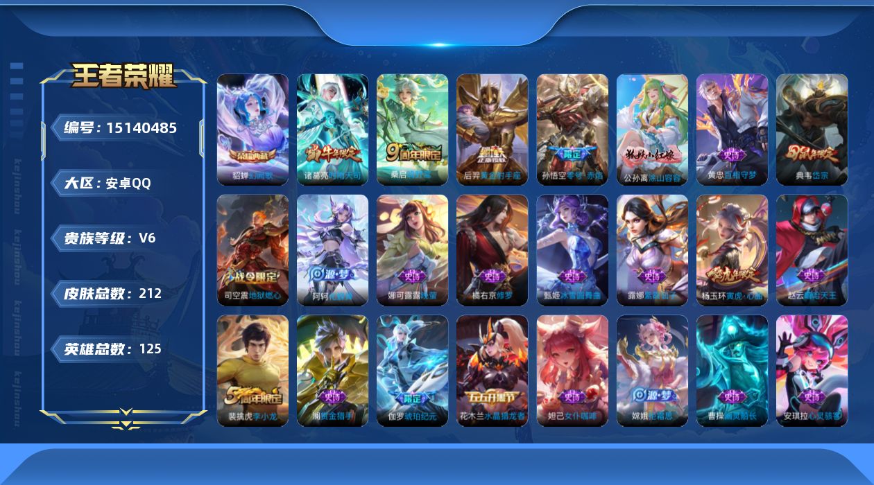 [15140485]中路44段/打野35段 安卓Q-V6-永恒钻石IV段位-125英雄-211皮肤-1典藏-4传说-56史诗 【荣耀典藏】:貂蝉幻阙歌 【传说皮肤】:桑启鸣野蒿,诸葛亮时雨天司,孙悟空零号赤焰,后羿黄金射手座 【限定皮肤】:蔡文姬夏日便利店,虞姬夏日便利店,姜子牙天穹之誓,狄仁杰阴阳师,赵云皇家上将,孙尚香蔷薇恋人,高渐离死亡摇滚,高渐离玩趣恶龙,芈月重明,芈月幻夜卜梦,夏侯惇朔风刀,甄姬游园惊梦,曹操烛龙,典韦穷奇,典韦岱宗,狄仁杰魔术师,狄仁杰万华元夜,达摩沙漠行僧,项羽海滩派对,老夫子醍醐杖,程咬金演武夺筹,兰陵王金庭之子,孙悟空零号赤焰,牛魔御旌,李元芳云中旅人,钟馗驱傩正仪,杨玉环遇见飞天,杨玉环寅虎心曲,雅典娜黎明之约,太乙真人饕餮,鬼谷子原初探秘者,诸葛亮时雨天司,黄忠火炮绅士,苏烈千军破阵,百里玄策原初追逐者,弈星混沌棋,梦奇顽趣,沈梦溪大漠名商,明世隐疑决卦,裴擒虎李小龙,狂铁御狮,米莱狄御霄,云中君纤云弄巧,盾山御銮,上官婉儿梁祝,嫦娥拒霜思,艾琳流音漫舞,司空震地狱燃心,阿古朵江河有灵,张良古海寻踪,蒙犽百解令,蒙恬荣光圣徽,鬼谷子天穹祈灯,伽罗琥珀纪元,程咬金群星魔术团 【年限皮肤】:杨玉环寅虎心曲,诸葛亮时雨天司,典韦岱宗 【赛季限定】:芈月重明,夏侯惇朔风刀,曹操烛龙,典韦穷奇,狄仁杰万华元夜,达摩沙漠行僧,老夫子醍醐杖,程咬金演武夺筹,兰陵王金庭之子,张良古海寻踪,牛魔御旌,李元芳云中旅人,钟馗驱傩正仪,雅典娜黎明之约,太乙真人饕餮,鬼谷子原初探秘者,苏烈千军破阵,百里玄策原初追逐者,弈星混沌棋,梦奇顽趣,沈梦溪大漠名商,明世隐疑决卦,狂铁御狮,米莱狄御霄,盾山御銮,鬼谷子天穹祈灯,蒙恬荣光圣徽,姜子牙天穹之誓 【战令限定】:蔡文姬夏日便利店,虞姬夏日便利店,芈月幻夜卜梦,艾琳流音漫舞,黄忠火炮绅士,司空震地狱燃心 【史诗皮肤】:露娜紫霞仙子,赵云嘻哈天王,赵云皇家上将,赵云未来纪元,貂蝉圣诞恋歌,甄姬冰雪圆舞曲,王昭君偶像歌手,狄仁杰魔术师,宫本武藏鬼剑武藏,孙尚香蔷薇恋人,孙尚香水果甜心,嬴政摇滚巨星,妲己魅力维加斯,妲己女仆咖啡,墨子金属风暴,吕布圣诞狂欢,刘禅绅士熊喵,曹操幽灵船长,张飞乱世虎臣,花木兰水晶猎龙者,刘邦德古拉伯爵,夏侯惇乘风破浪,小乔缤纷独角兽,兰陵王暗隐猎兽者,甄姬游园惊梦,雅典娜冰冠公主,安琪拉心灵骇客,百里守