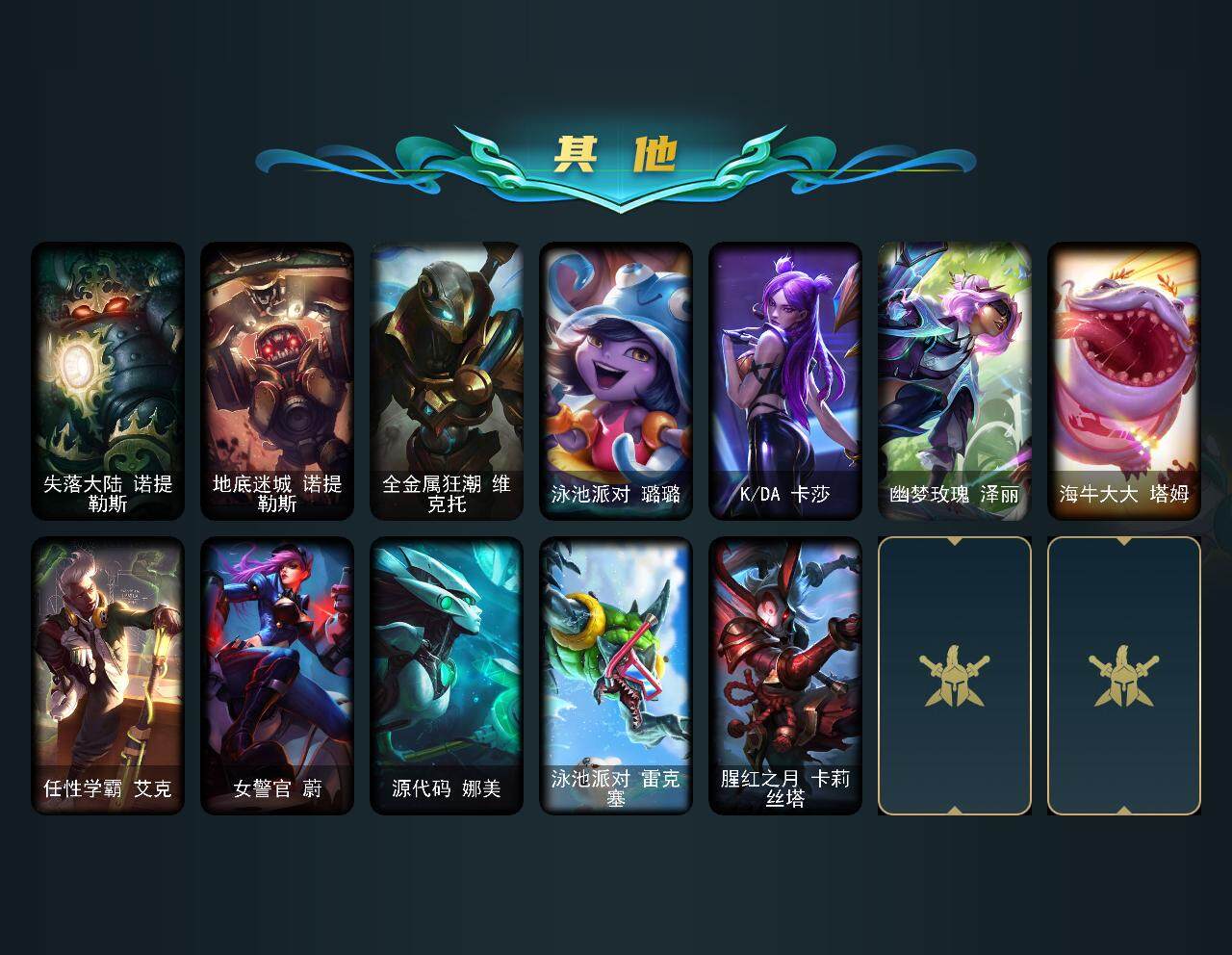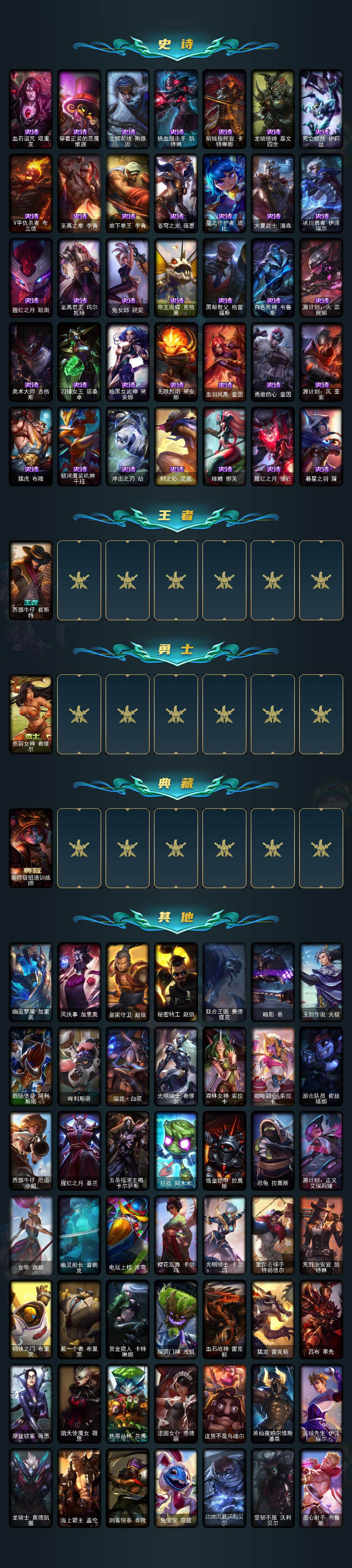 【史诗皮肤】:科学怪熊的新娘安妮,绞肉机角斗士赵信,摄魂男爵弗拉基米尔,铁钩船长费德提克,铁血剑豪易,源代码索拉卡,熊猫提莫,火箭达人崔丝塔娜,火牙狼人沃里克,黑帮狂花厄运小姐,国王泰达米尔,少林武僧贾克斯,掠星魔刃卡萨丁,夜刃艾瑞莉娅,血石诅咒塔里克,穿着正装的恶魔维迦,北领前线斯维因,铁血狙击手凯特琳,前线指挥官卡特琳娜,龙骑统帅嘉文四世,死亡绽放伊莉丝,V字仇杀者布兰德,至高之拳李青,地下拳王李青,苍穹之光薇恩,星之守护者波比,大夏武士潘森,冰川勇者伊泽瑞尔,腥红之月凯南,至高君王玛尔扎哈,兔女郎锐雯,帝王斑蝶克格莫,黑帮教父格雷福斯,白色死神韦鲁斯,源计划火菲奥娜,奥术大师吉格斯,刀锋女王丽桑卓,暗黑女武神黛安娜,无限烈焰黛安娜,血羽凤凰奎因,勇敢的心奎因,源计划风亚索,猛虎布隆,银河魔装机神千珏,冲击之刃劫,时之砂艾克,锦鲤娜美,腥红之月锤石,暮星之羽霞