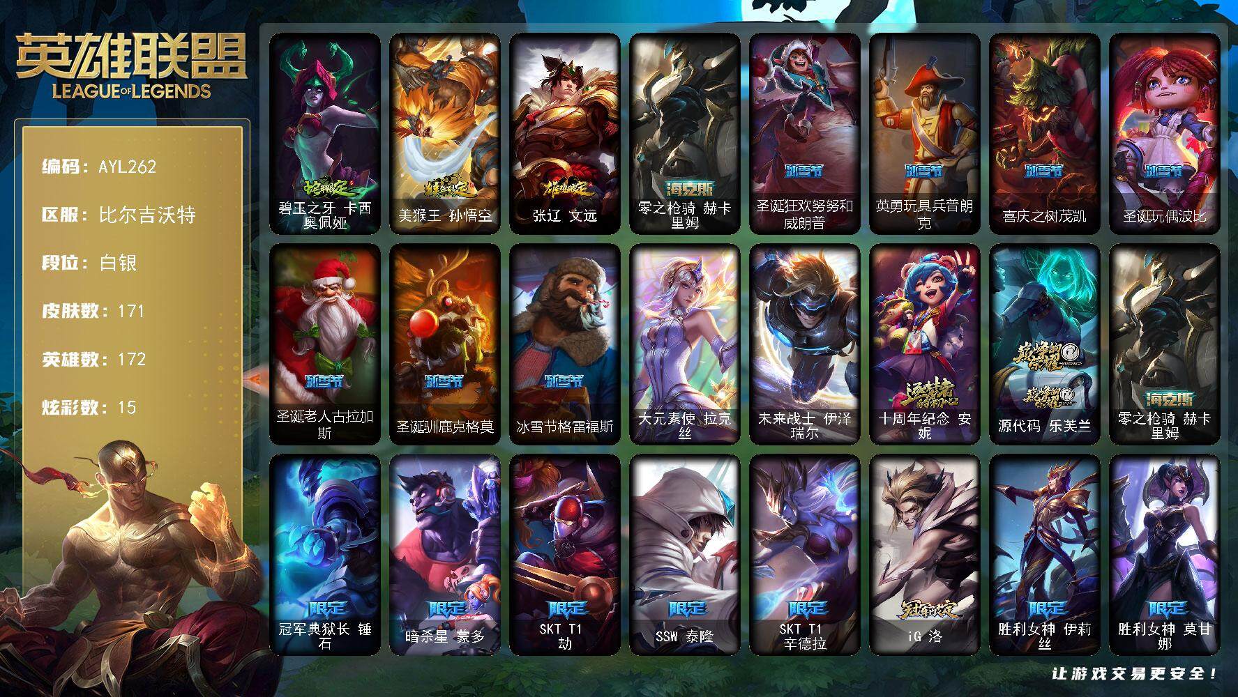 [15141477]【店主推荐捡漏号!可直接换绑】白银段位-172英雄-171皮肤-15炫彩-2终极-3神话-28限定-25传说-49史诗 【臻彩皮肤】:冠军典狱长锤石凯旋圣装,西部魔影执行人卡特琳娜纯洁 【年限皮肤】:碧玉之牙卡西奥佩娅,美猴王孙悟空,张辽文远 【海克斯皮肤】:零之枪骑赫卡里姆 【冰雪限定】:圣诞狂欢努努和威朗普,英勇玩具兵普朗克,喜庆之树茂凯,圣诞玩偶波比,圣诞老人古拉加斯,圣诞驯鹿克格莫,冰雪节格雷福斯 【终极皮肤】:大元素使拉克丝,未来战士伊泽瑞尔 【神话皮肤】:十周年纪念安妮,源代码乐芙兰,零之枪骑赫卡里姆 【限定皮肤】:冠军典狱长锤石,暗杀星蒙多,SKTT1劫,SSW泰隆,SKTT1辛德拉,iG洛,胜利女神伊莉丝,胜利女神莫甘娜,胜利女神希维尔,胜利之树茂凯,胜利枪神格雷福斯,胜利女神奥莉安娜,泳池派对雷克顿,泳池派对李青,都铎王朝图奇,制胜金靴李青,防暴天使凯尔,警用试作体K9内瑟斯 【传说皮肤】:铁哥们儿奥拉夫,战地机甲厄加特,邪鸦魅影乐芙兰,战场女武神凯尔,钢铁之翼凯尔,恶魔男爵瑞兹,欧米伽小队幽灵特工,烈焰雄心崔丝塔娜,源计划联合艾希,未来战士凯特琳,苹果机器人布里茨,神拳李青,源计划净化薇恩,银河魔装机神兰博,第三类接触黑默丁格,屠龙勇士潘森,星之守护者拉克丝,黯黑魔龙希瓦娜,泳池派对吉格斯,金牌主播德莱文,灌篮高手德莱厄斯,蔷薇绅士杰斯,星之守护者金克丝,西部魔影卢锡安,暗星锤石 【史诗皮肤】:科学怪熊的新娘安妮,绞肉机角斗士赵信,摄魂男爵弗拉基米尔,铁钩船长费德提克,铁血剑豪易,源代码索拉卡,熊猫提莫,火箭达人崔丝塔娜,火牙狼人沃里克,黑帮狂花厄运小姐,国王泰达米尔,少林武僧贾克斯,掠星魔刃卡萨丁,夜刃艾瑞莉娅,血石诅咒塔里克,穿着正装的恶魔维迦,北领前线斯维因,铁血狙击手凯特琳,前线指挥官卡特琳娜,龙骑统帅嘉文四世,死亡绽放伊莉丝,V字仇杀者布兰德,至高之拳李青,地下拳王李青,苍穹之光薇恩,星之守护者波比,大夏武士潘森,冰川勇者伊泽瑞尔,腥红之月凯南,至高君王玛尔扎哈,兔女郎锐雯,帝王斑蝶克格莫,黑帮教父格雷福斯,白色死神韦鲁斯,源计划火菲奥娜,奥术大师吉格斯,刀锋女王丽桑卓,暗黑女武神黛安娜,无限烈焰黛安娜,血羽凤凰奎因,勇敢的心奎因,源计划风亚索,猛虎布隆,银河魔装机神千珏,冲击之刃劫,时之砂艾克,锦鲤娜美,腥红之月锤石,暮星之羽霞 【