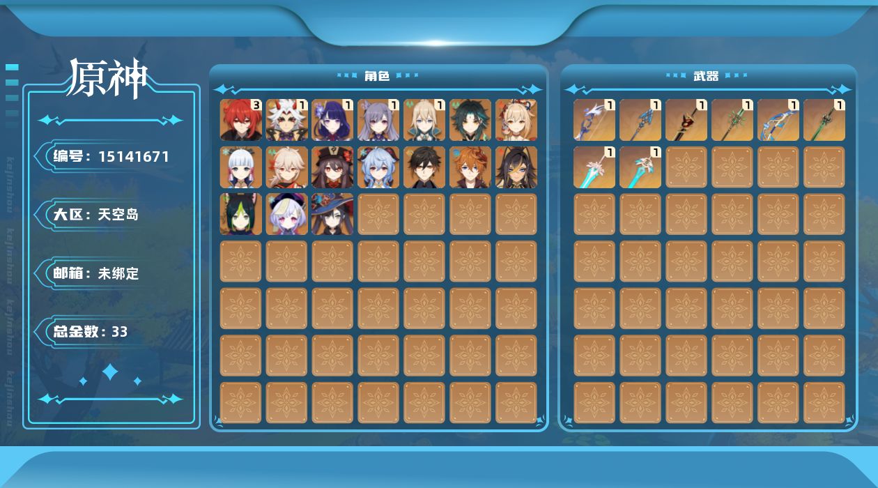 0命迪希雅,0命提纳里,1命荒泷一斗,1命雷电将军,0命枫原万叶,0命神里绫华,0命钟离,0命胡桃,0命甘雨,0命魈,0命宵宫,0命达达利亚,1命刻晴,0命七七,1命琴,0命莫娜,3命迪卢克,精1若水,精1息灾,精1赤角石溃杵,精1终末嗟叹之诗,精1磐岩结绿,精1和璞鸢,精1天空之刃,精1天空之傲