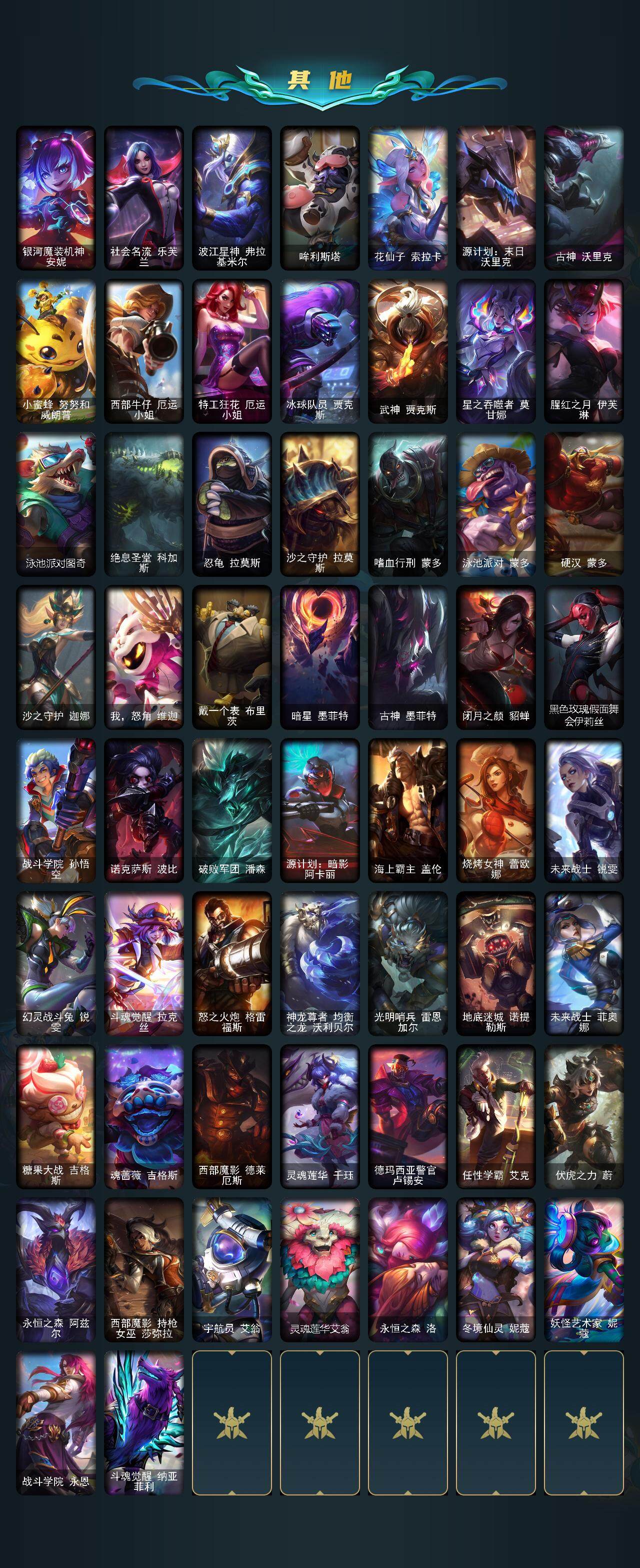 【其他皮肤1】:银河魔装机神安妮,社会名流乐芙兰,波江星神弗拉基米尔,哞利斯塔,花仙子索拉卡,源计划末日沃里克,古神沃里克,小蜜蜂努努和威朗普,西部牛仔厄运小姐,特工狂花厄运小姐,冰球队员贾克斯,武神贾克斯,星之吞噬者莫甘娜,腥红之月伊芙琳,泳池派对图奇,绝息圣堂科加斯,忍龟拉莫斯,沙之守护拉莫斯,嗜血行刑蒙多,泳池派对蒙多,硬汉蒙多,沙之守护迦娜,我怒角维迦,戴一个表布里茨,暗星墨菲特,古神墨菲特,闭月之颜貂蝉,黑色玫瑰假面舞会伊莉丝,战斗学院孙悟空,诺克萨斯波比,破败军团潘森,源计划暗影阿卡丽,海上霸主盖伦,烧烤女神蕾欧娜,未来战士锐雯,幻灵战斗兔锐雯,斗魂觉醒拉克丝,怒之火炮格雷福斯,神龙尊者均衡之龙沃利贝尔,光明哨兵雷恩加尔,地底迷城诺提勒斯,未来战士菲奥娜,糖果大战吉格斯,魂蔷薇吉格斯,西部魔影德莱厄斯,灵魂莲华千珏,德玛西亚警官卢锡安,任性学霸艾克,伏虎之力蔚,永恒之森阿兹尔,西部魔影持枪女巫莎弥拉,宇航员艾翁,灵魂莲华艾翁,永恒之森洛,冬境仙灵妮蔻,妖怪艺术家妮蔻,战斗学院永恩,斗魂觉