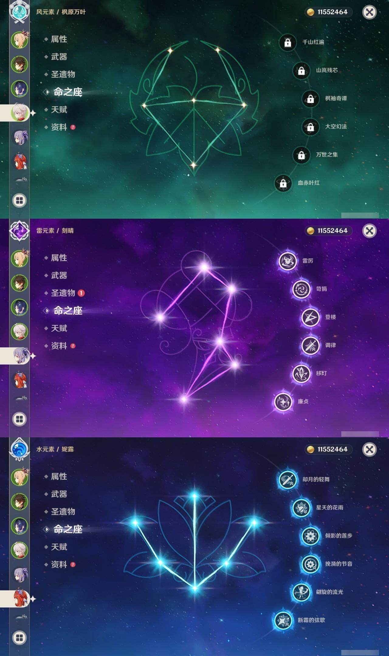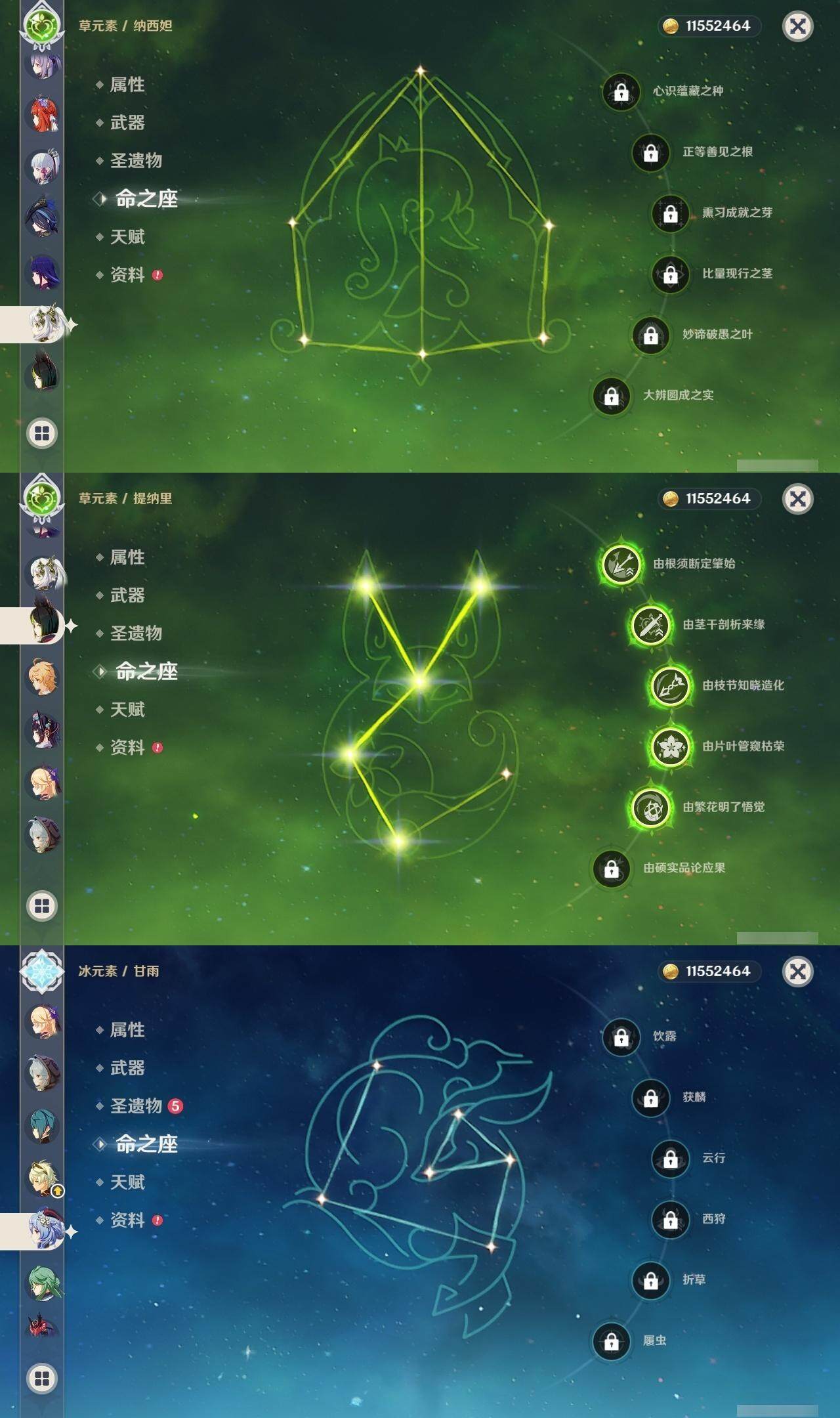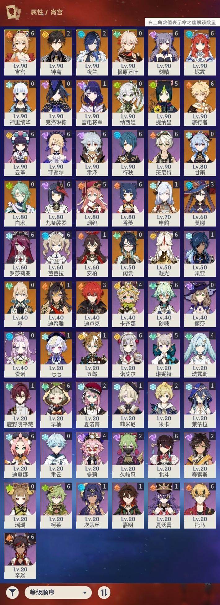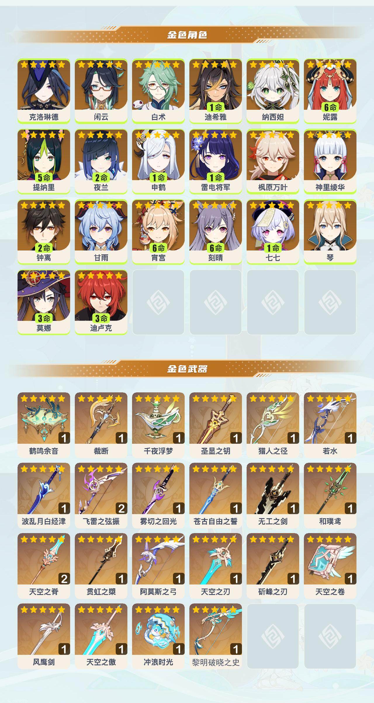 0命克洛琳德,0命闲云,0命白术,1命迪希雅,0命纳西妲,满命妮露,5命提纳里,2命夜兰,1命申鹤,1命雷电将军,0命枫原万叶,0命神里绫华,2命钟离,0命甘雨,满命宵宫,满命刻晴,1命七七,0命琴,3命莫娜,3命迪卢克,精1鹤鸣余音,精1裁断,精1千夜浮梦,精1圣显之钥,精1猎人之径,精1若水,精1波乱月白经津,精2飞雷之弦振,精1雾切之回光,精1苍古自由之誓,精1无工之剑,精1和璞鸢,精2天空之脊,精1贯虹之槊,精1阿莫斯之弓,精1天空之刃,精1斫峰之刃,精1天空之卷,精1风鹰剑,精1天空之傲,精1冲浪时光,精1黎明破晓之史