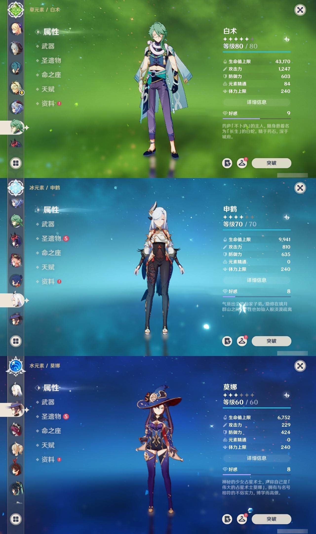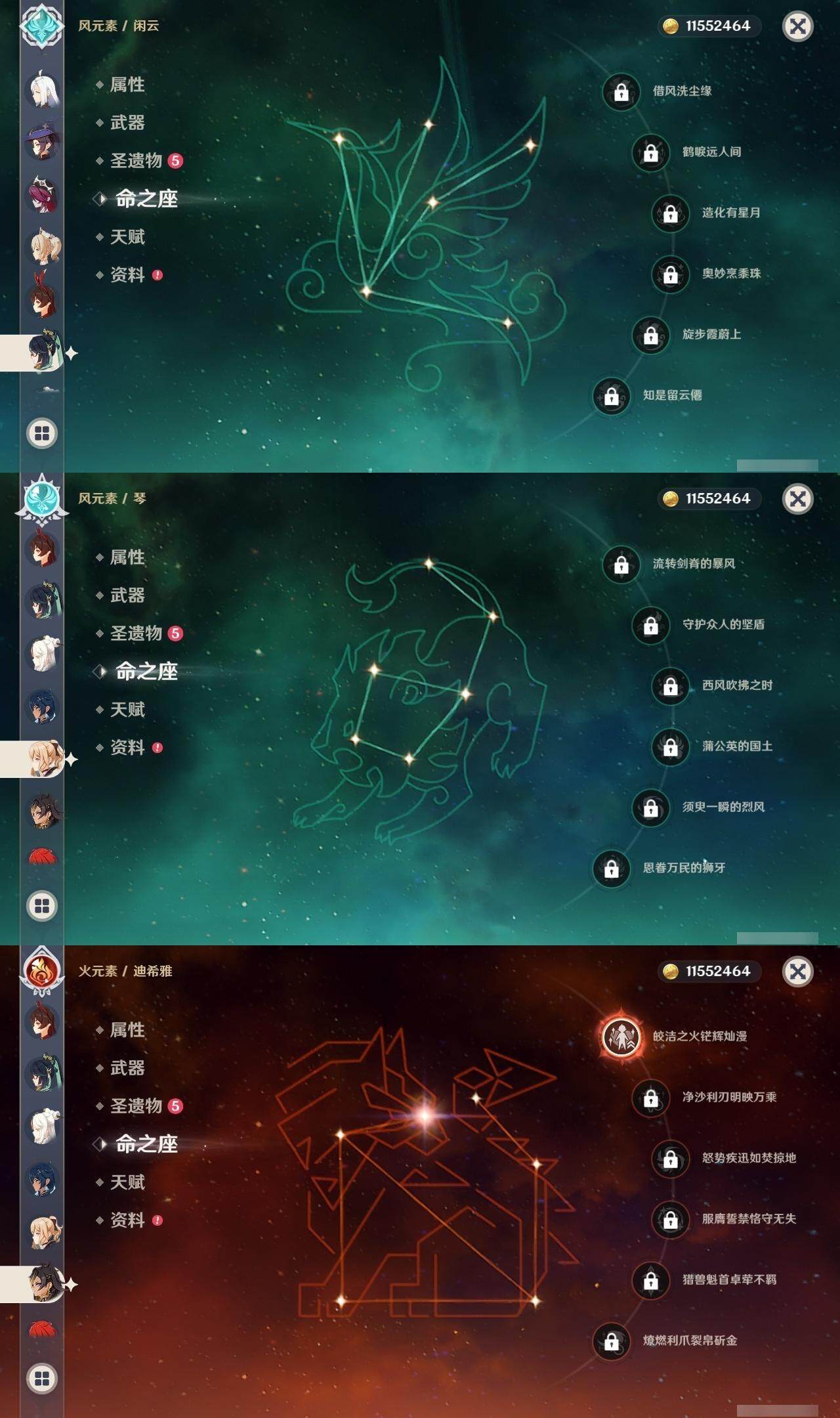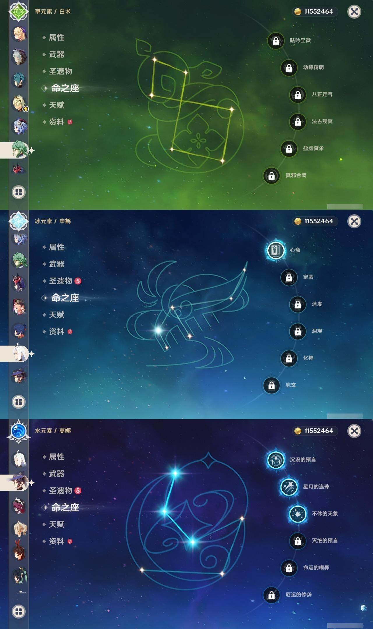 0命克洛琳德,0命闲云,0命白术,1命迪希雅,0命纳西妲,满命妮露,5命提纳里,2命夜兰,1命申鹤,1命雷电将军,0命枫原万叶,0命神里绫华,2命钟离,0命甘雨,满命宵宫,满命刻晴,1命七七,0命琴,3命莫娜,3命迪卢克,精1鹤鸣余音,精1裁断,精1千夜浮梦,精1圣显之钥,精1猎人之径,精1若水,精1波乱月白经津,精2飞雷之弦振,精1雾切之回光,精1苍古自由之誓,精1无工之剑,精1和璞鸢,精2天空之脊,精1贯虹之槊,精1阿莫斯之弓,精1天空之刃,精1斫峰之刃,精1天空之卷,精1风鹰剑,精1天空之傲,精1冲浪时光,精1黎明破晓之史