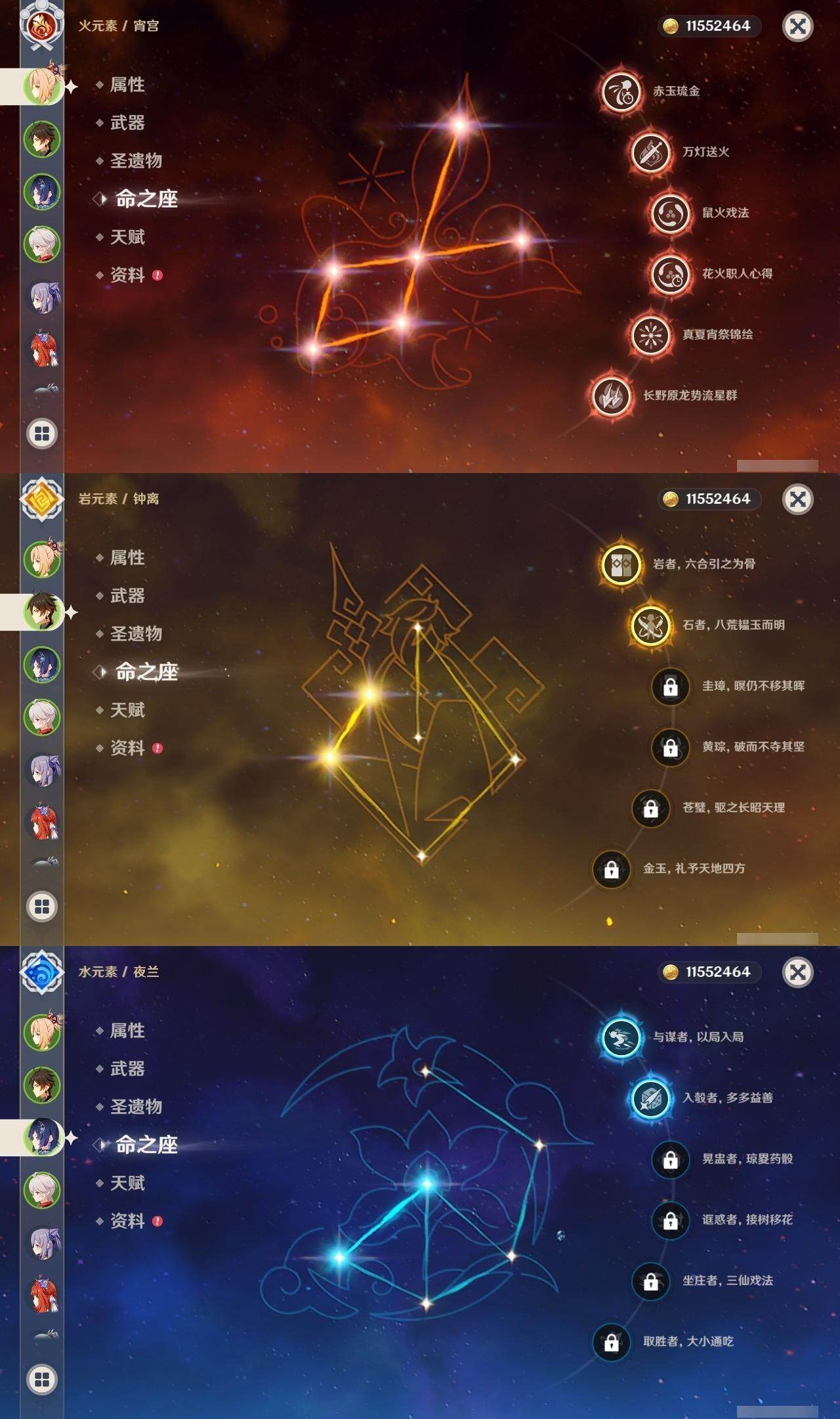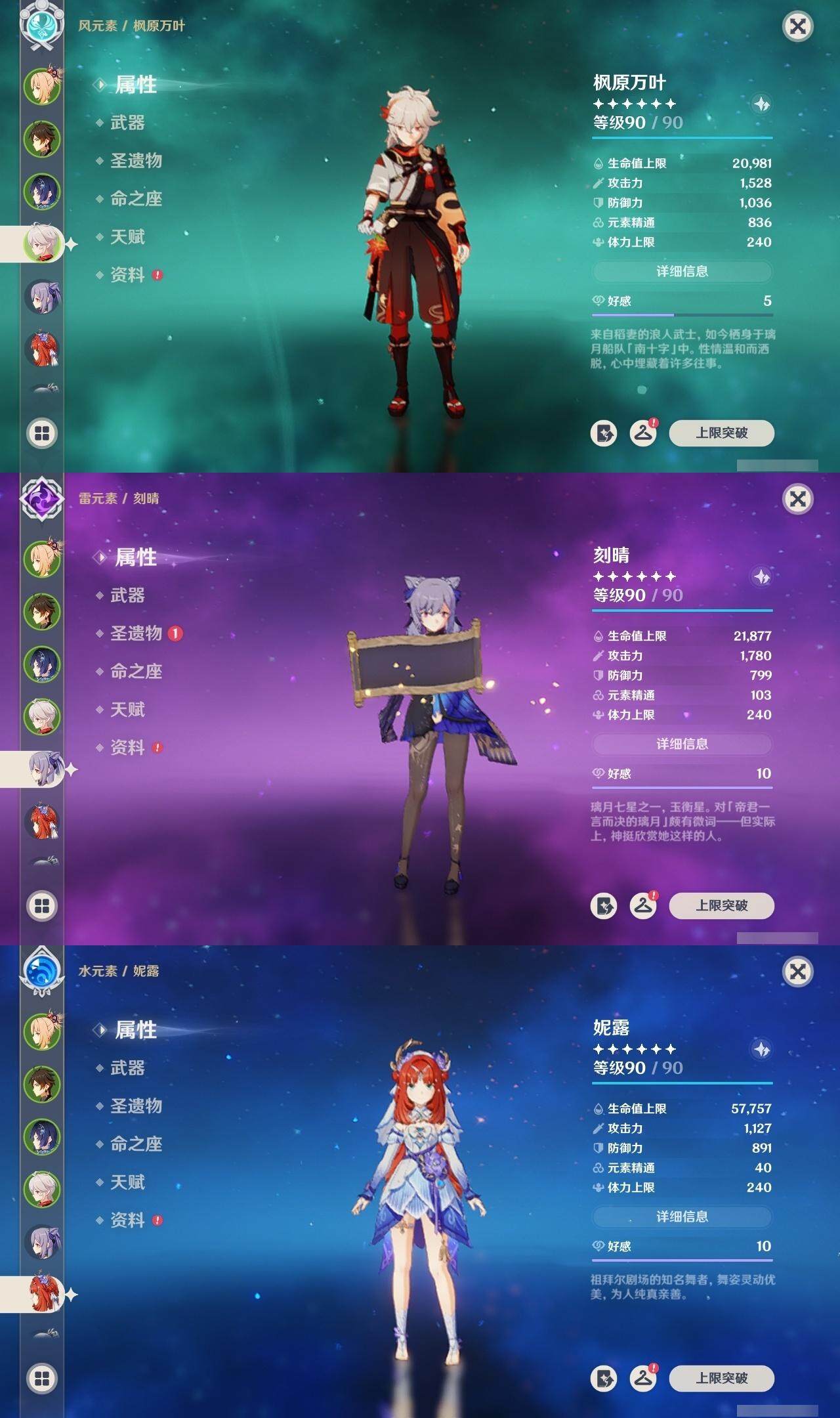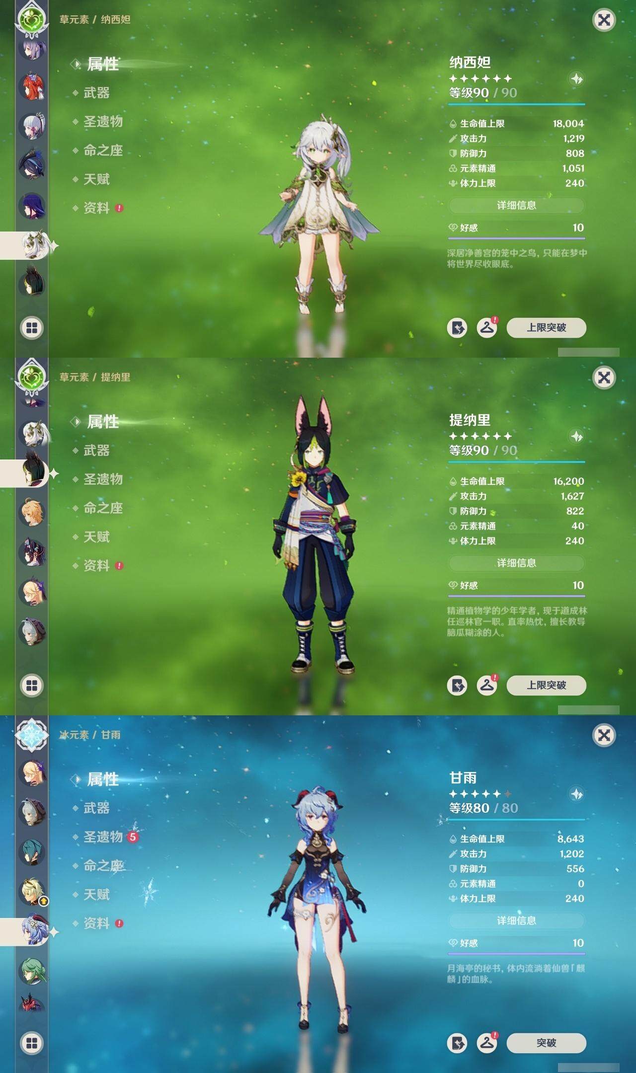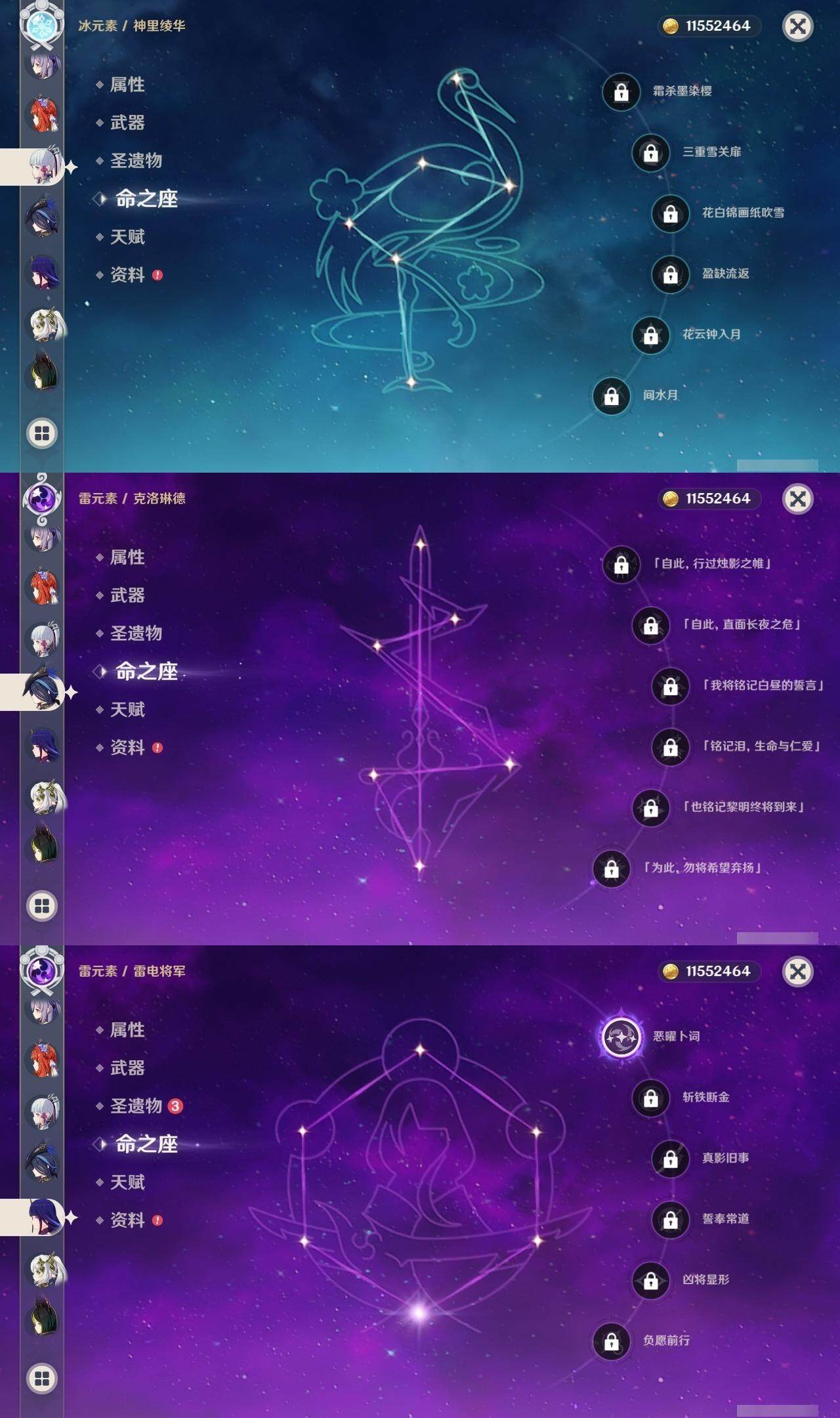 0命克洛琳德,0命闲云,0命白术,1命迪希雅,0命纳西妲,满命妮露,5命提纳里,2命夜兰,1命申鹤,1命雷电将军,0命枫原万叶,0命神里绫华,2命钟离,0命甘雨,满命宵宫,满命刻晴,1命七七,0命琴,3命莫娜,3命迪卢克,精1鹤鸣余音,精1裁断,精1千夜浮梦,精1圣显之钥,精1猎人之径,精1若水,精1波乱月白经津,精2飞雷之弦振,精1雾切之回光,精1苍古自由之誓,精1无工之剑,精1和璞鸢,精2天空之脊,精1贯虹之槊,精1阿莫斯之弓,精1天空之刃,精1斫峰之刃,精1天空之卷,精1风鹰剑,精1天空之傲,精1冲浪时光,精1黎明破晓之史