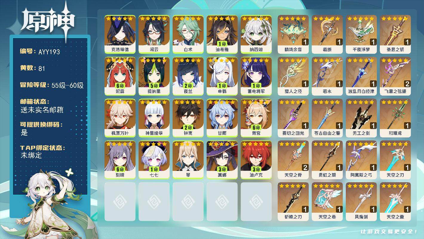 [15141795]58级/81黄/男主/20个五星角色/22个五星武器 0命克洛琳德,0命闲云,0命白术,1命迪希雅,0命纳西妲,满命妮露,5命提纳里,2命夜兰,1命申鹤,1命雷电将军,0命枫原万叶,0命神里绫华,2命钟离,0命甘雨,满命宵宫,满命刻晴,1命七七,0命琴,3命莫娜,3命迪卢克,精1鹤鸣余音,精1裁断,精1千夜浮梦,精1圣显之钥,精1猎人之径,精1若水,精1波乱月白经津,精2飞雷之弦振,精1雾切之回光,精1苍古自由之誓,精1无工之剑,精1和璞鸢,精2天空之脊,精1贯虹之槊,精1阿莫斯之弓,精1天空之刃,精1斫峰之刃,精1天空之卷,精1风鹰剑,精1天空之傲,精1冲浪时光,精1黎明破晓之史