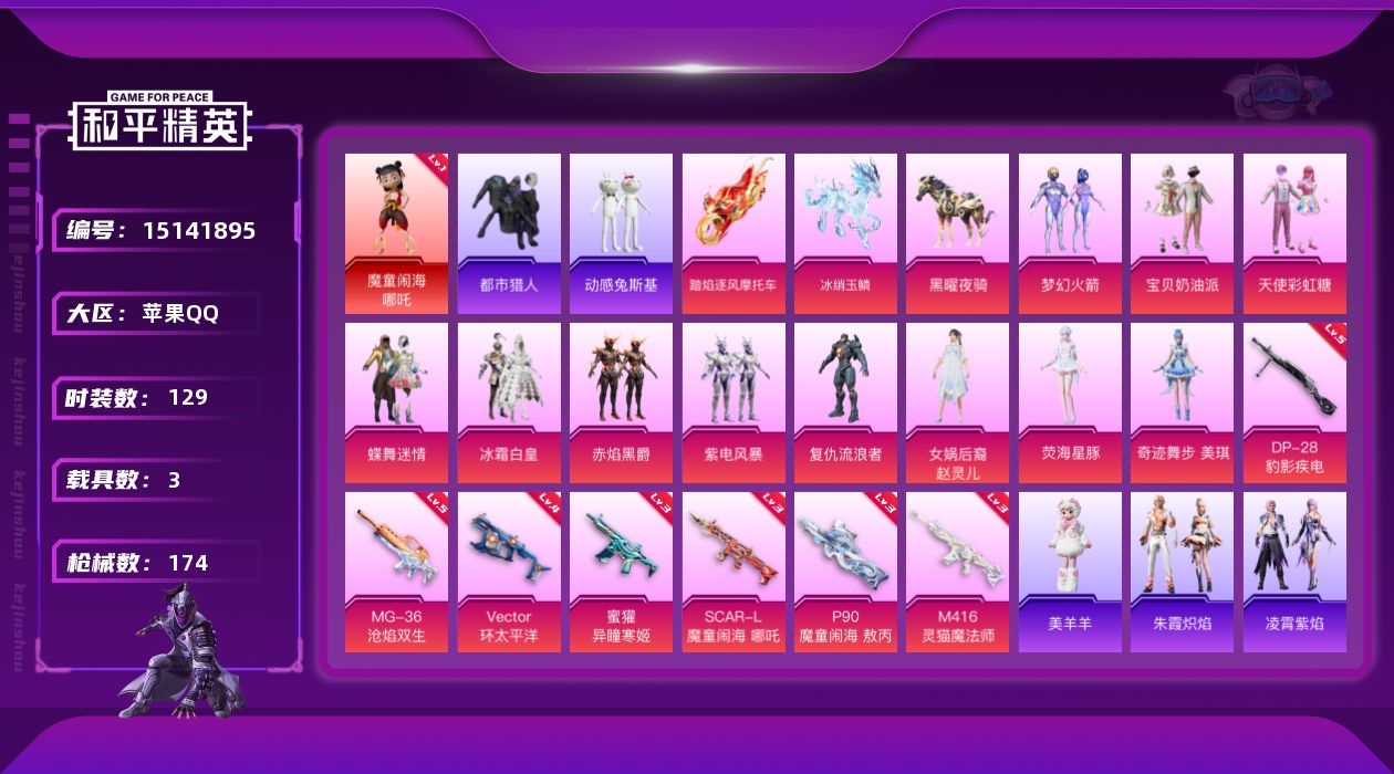 [15141895]【店主推荐捡漏号!可直接换绑】背包2200红碎片 素材身法号/无敌战神框1/苹果 手Q-无敌战神框-1神装-11粉装-7特效枪-3载具-4粉色飞行器-5.8w热力值-10王牌印记-129套装-174枪皮【红色神装等级】:魔童闹海-哪吒(一级)【热门品类】:粉装-梦幻火箭,套装-浪漫天命,套装-都市猎人,套装-小丑鱼,角色-军刀雅典娜,套装-动感兔斯基人偶服,套装-暗影哥特,套装-浪漫波比【粉色载具】:踏焰逐风摩托车,黑曜夜骑,冰绡玉鳞【粉色套装】:粉装-宝贝奶油派,粉装-天使彩虹糖,粉装-蝶舞迷情,粉装-梦幻火箭,粉装-冰霜白皇,粉装-赤焰黑爵,粉装-紫电风暴,角色-复仇流浪者,女娲后裔-赵灵儿,角色-荧海星豚,角色-奇迹舞步 美琪【粉色枪皮等级】:SCAR-L-魔童闹海 哪吒(三级),M416-灵猫魔法师(三级),蜜獾-异瞳寒姬(三级),Vector-环太平洋(四级),P90-魔童闹海 敖丙(三级),DP-28-豹影疾电(五级),MG-36-沧焰双生(五级)【粉色飞行器】:庄周梦蝶飞行器,灵猫魔法师飞行器,飞天猪飞行器,灵珠游龙飞行器