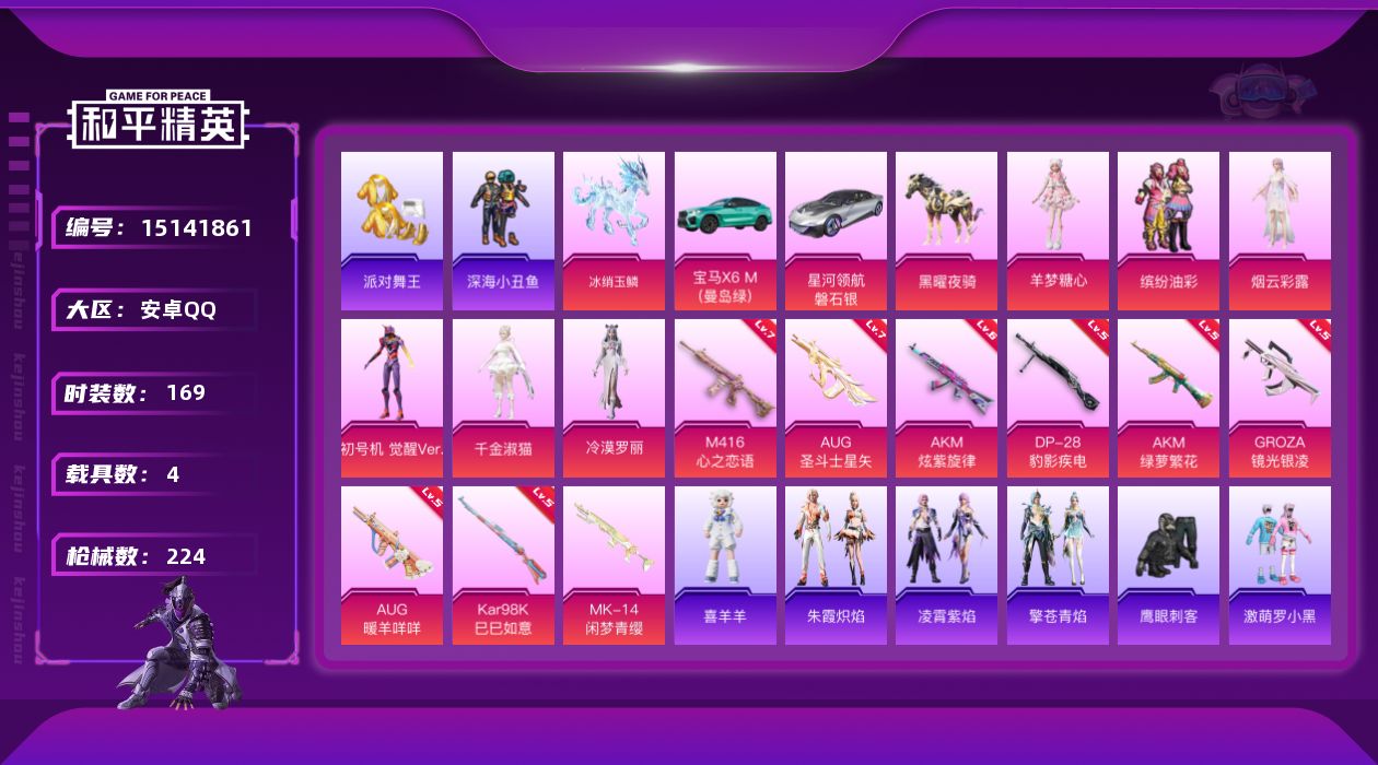 [15141861]素材身法号/绝世印记1/地铁满天赋【特价急出/详情看图】:安卓 手Q-6粉装-9特效枪-4载具-5粉色飞行器-7.6w热力值-9王牌印记-169套装-224枪皮【热门品类】:粉装-缤纷油彩,套装-浪漫天命,套装-派对舞王,套装-深海小丑鱼,套装-AG战队服,套装-龟仙人,套装-暗影哥特,套装-粉红小猪,角色-8号机,角色-Mark.06【粉色载具】:宝马X6 M(曼岛绿),星河领航(磐石银),黑曜夜骑,冰绡玉鳞【粉色套装】:粉装-缤纷油彩,角色-烟云彩露,角色-初号机 觉醒Ver.,角色-千金淑猫,角色-冷漠罗丽,角色-羊梦糖心【粉色枪皮等级】:AKM-炫紫旋律(六级),AKM-绿萝繁花(五级),M416-心之恋语(七级),GROZA-镜光银凌(五级),AUG-暖羊咩咩(五级),AUG-圣斗士星矢(七级),Kar98K-巳巳如意(五级),DP-28-豹影疾电(五级)【粉色飞行器】:天之羽翼飞行器,鎏金朋克飞行器,圣域金龙飞行器,灵猫魔法师飞行器,灵珠游龙飞行器