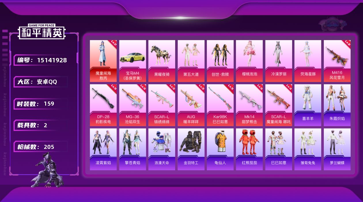 - PX_2088466- 可二次 苹果手Q-10王牌印记-4粉装-4特效枪-1载具-49012热力值-102套装-153枪皮-1卓越印记-0传奇印记, 【4粉装】,宝贝奶油派,幻彩电音,海盐物语,绚金战神, 【4特效枪】,M416-五爪金龙-7级,M416-风花雪月-5级,Kar98K-未来歌姬-5级,Kar98K-巳巳如意-2级, 【5稀有紫装】,都市猎人,Mark.06,深海小丑鱼,龟仙人,金羽