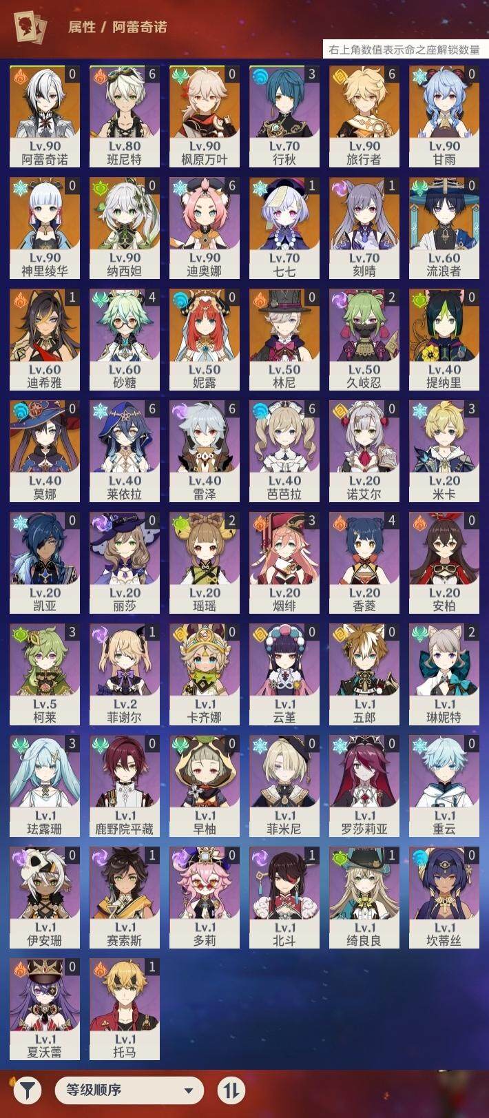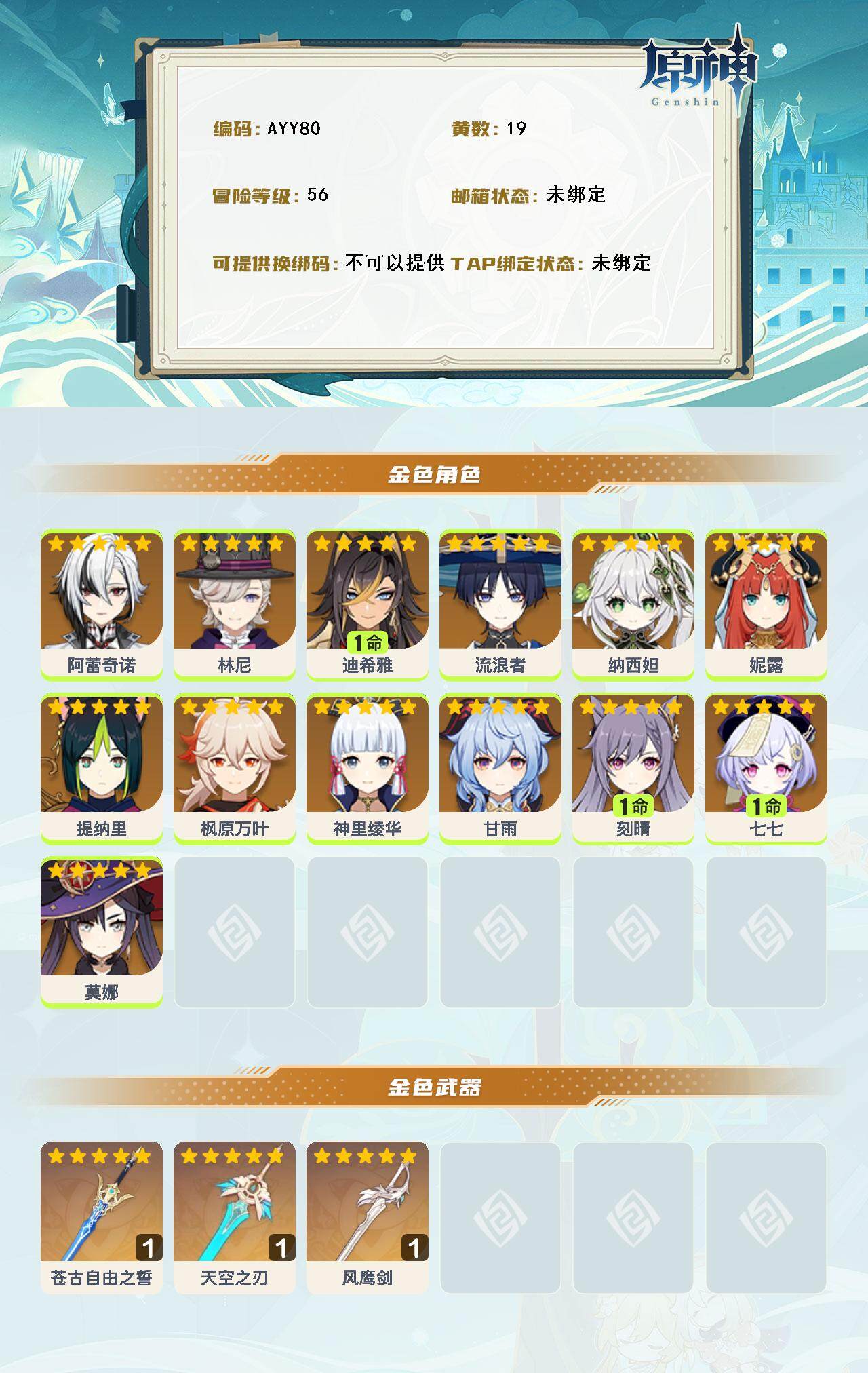 [15142011]56级/19黄/男主/13个五星角色/3个五星武器 0命阿蕾奇诺,0命林尼,1命迪希雅,0命流浪者,0命纳西妲,0命妮露,0命提纳里,0命枫原万叶,0命神里绫华,0命甘雨,1命刻晴,1命七七,0命莫娜,精1苍古自由之誓,精1天空之刃,精1风鹰剑