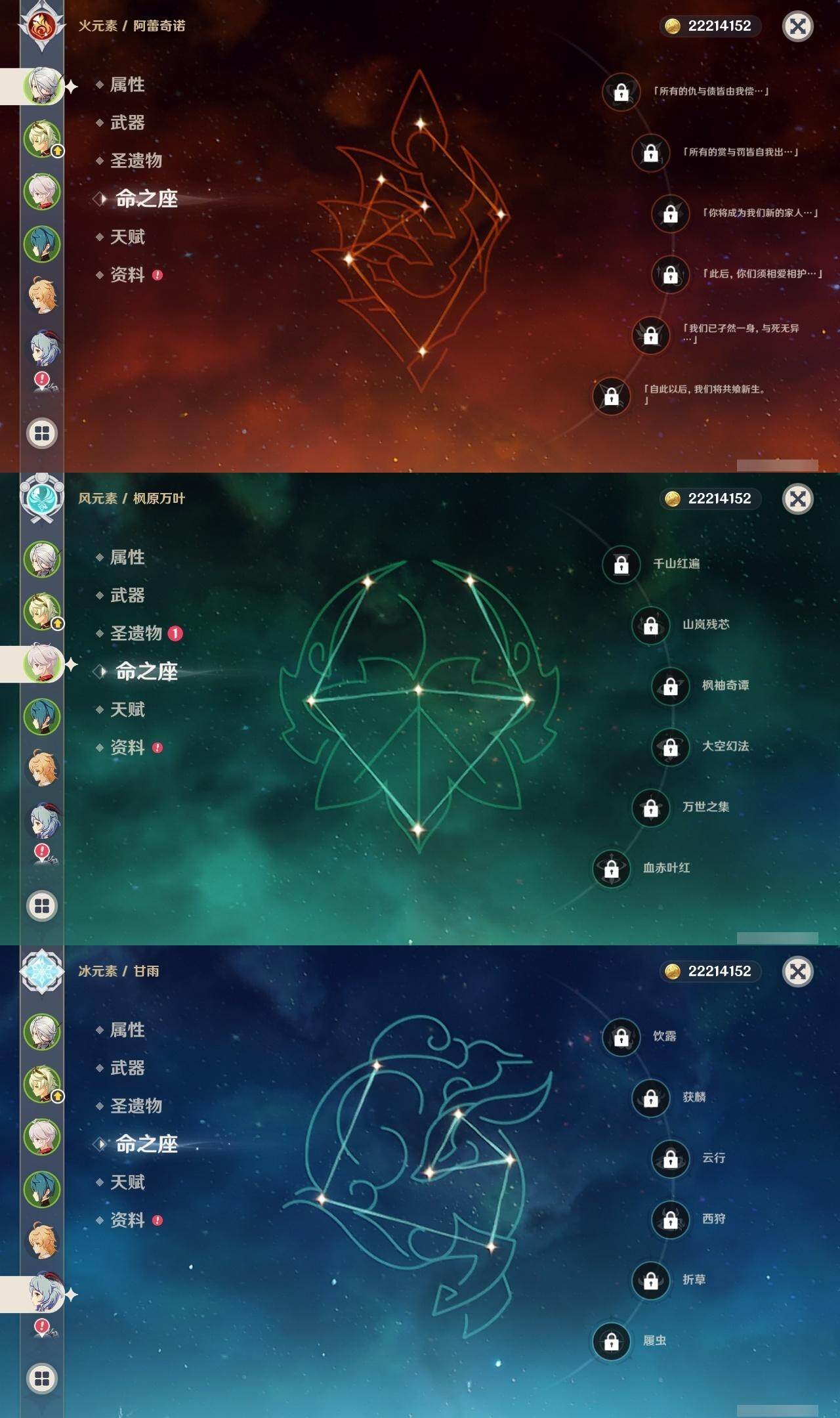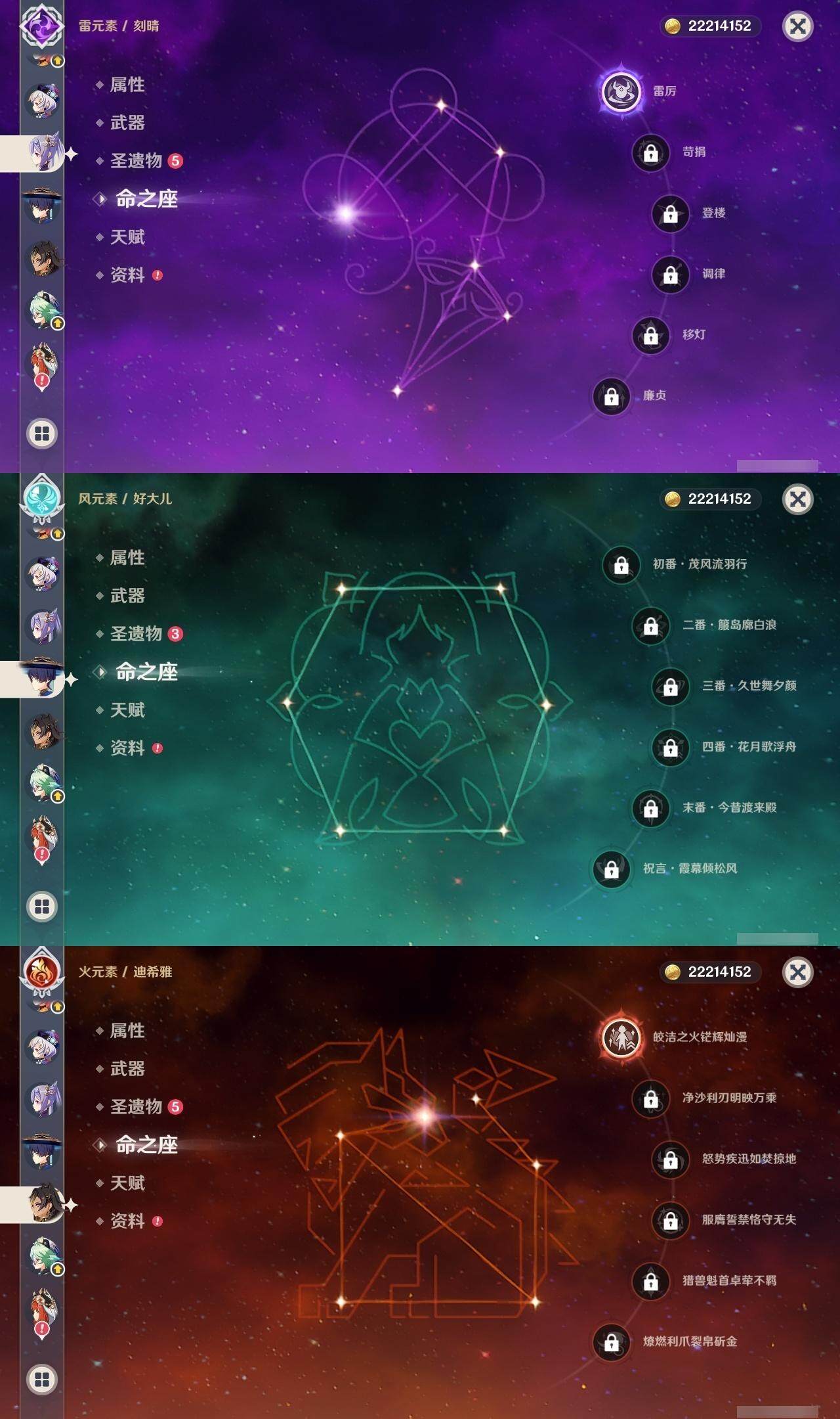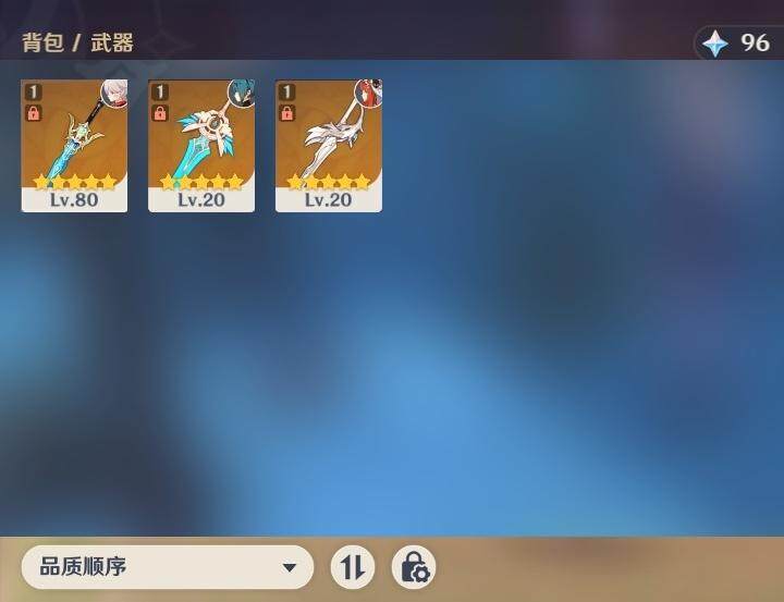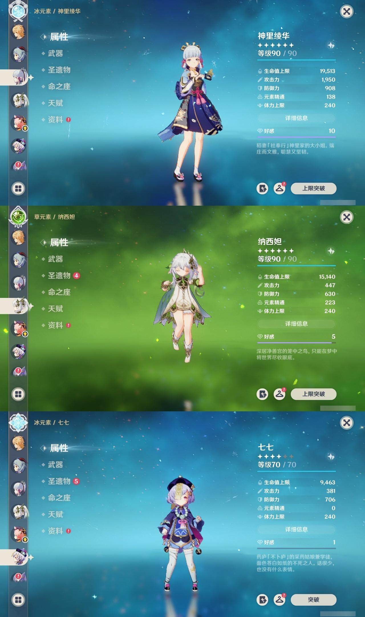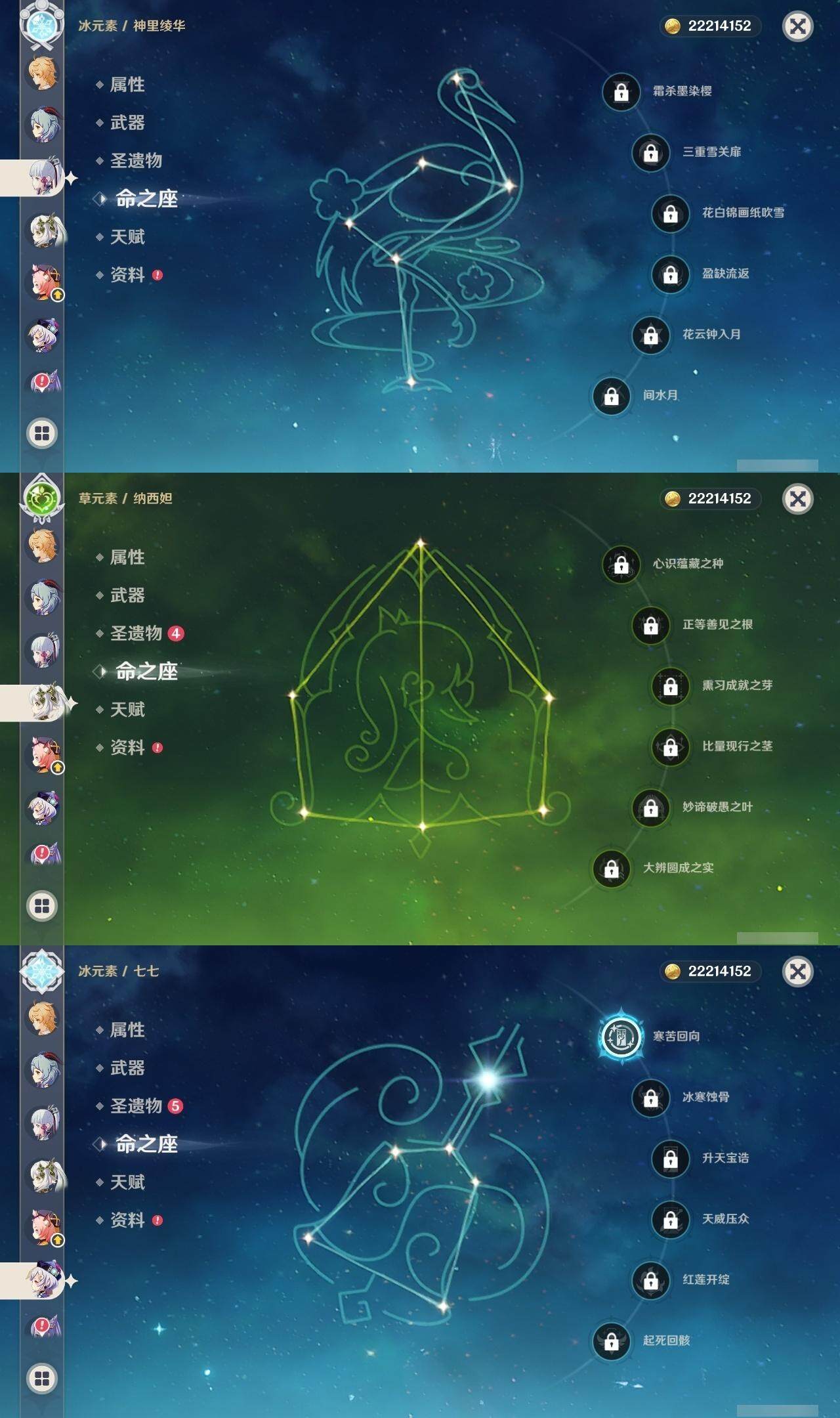 0命阿蕾奇诺,0命林尼,1命迪希雅,0命流浪者,0命纳西妲,0命妮露,0命提纳里,0命枫原万叶,0命神里绫华,0命甘雨,1命刻晴,1命七七,0命莫娜,精1苍古自由之誓,精1天空之刃,精1风鹰剑