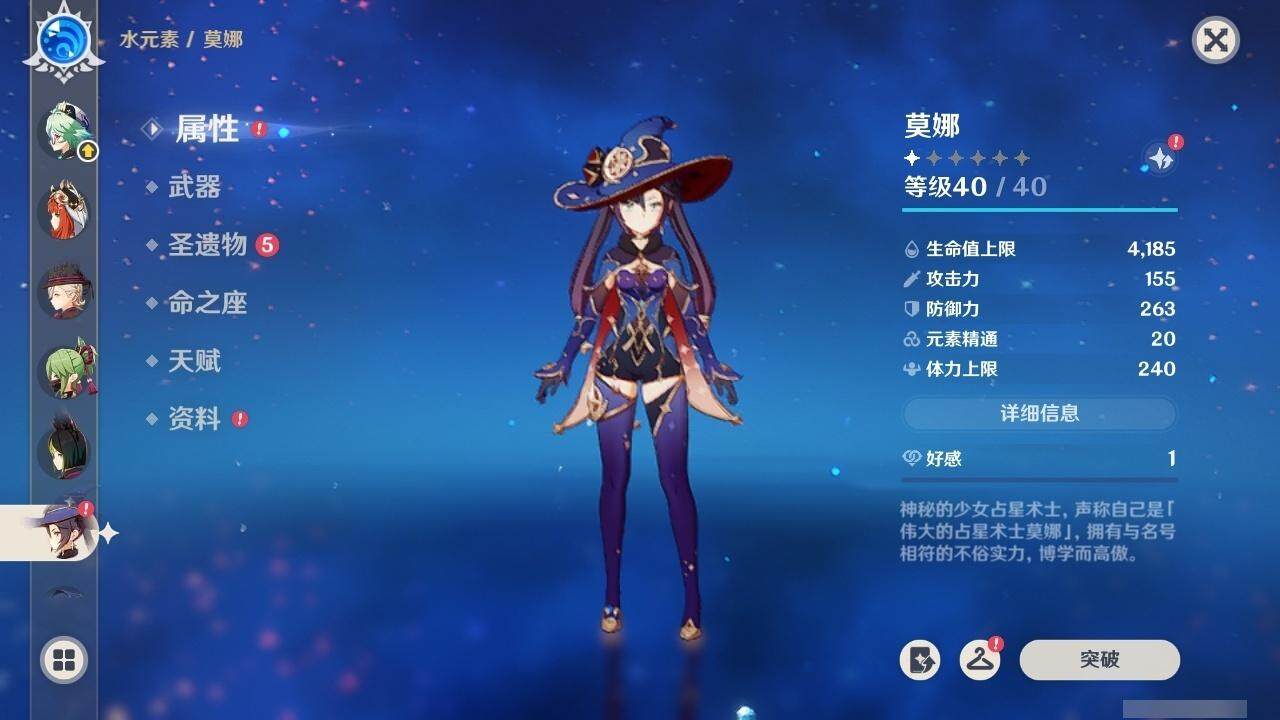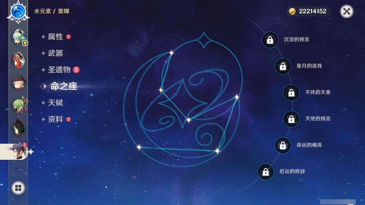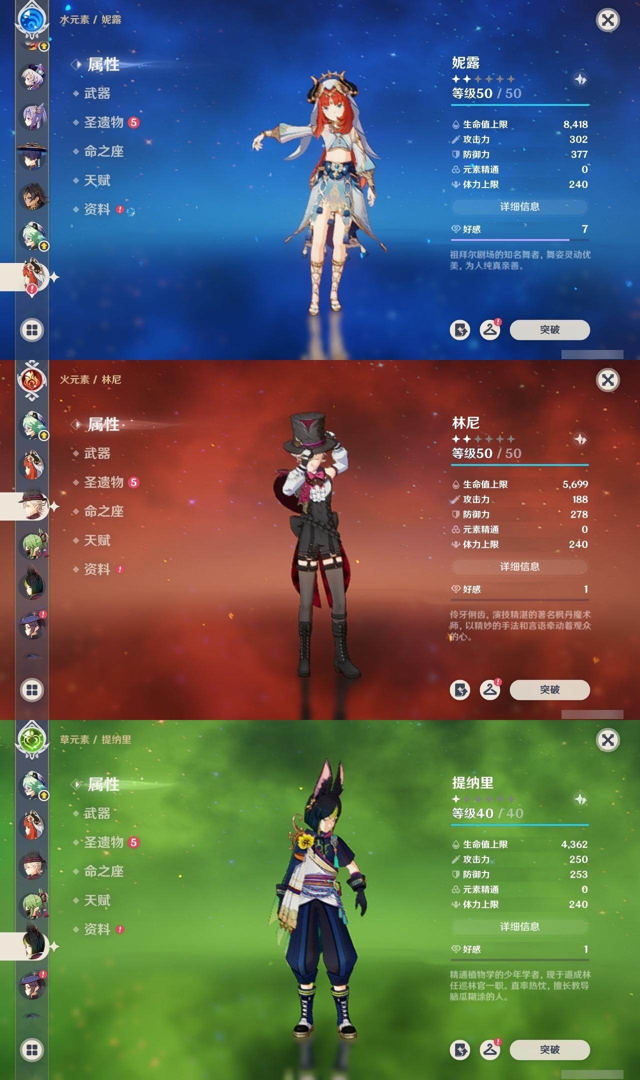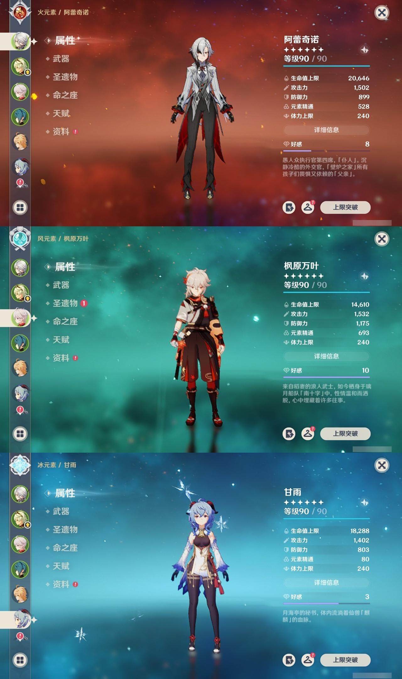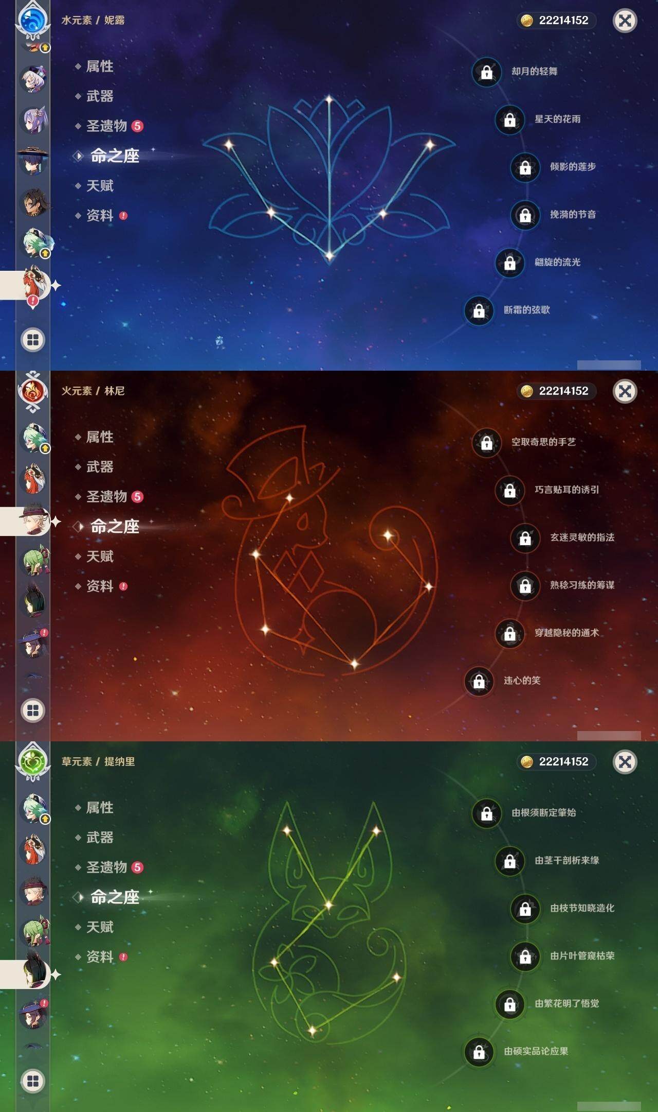 0命阿蕾奇诺,0命林尼,1命迪希雅,0命流浪者,0命纳西妲,0命妮露,0命提纳里,0命枫原万叶,0命神里绫华,0命甘雨,1命刻晴,1命七七,0命莫娜,精1苍古自由之誓,精1天空之刃,精1风鹰剑