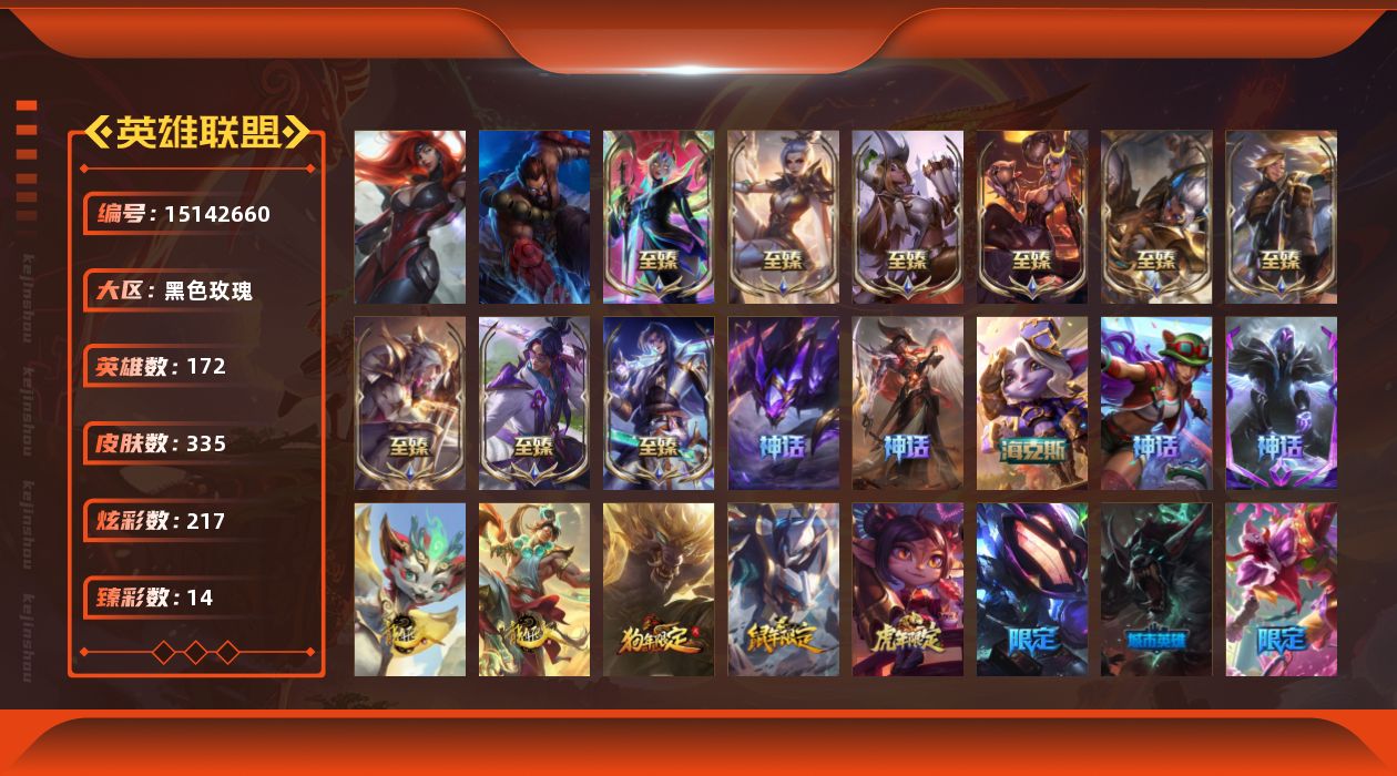 [15142660]【特价出售/店主推荐】黄金段位-172英雄-335皮肤-217炫彩-2终极-15神话-55限定-48传说-44史诗