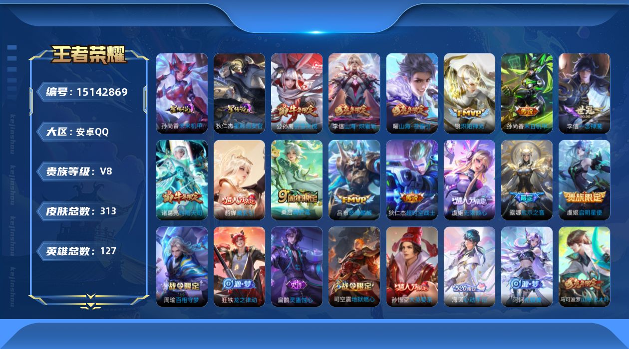 - [12256201]V10 3典藏 1珍品无双 2无双 2珍品传说 68传说 125英雄 444皮肤 可修改实名 优质装备:馥梦繁花,鸣剑·曳影,全息碎影(猴子典藏),银白咏叹调(倪克斯侍卫),韩信群星魔术团(韩信无双),天机白泽,酷洛米之心,大耳狗之梦,黄金射手座,云鹰飞将(小将军),绛天战甲(鸡嘴战神),猫影幻舞,久胜战神,炽阳神光,一念神魔,云霓雀翎,末日机甲-孙尚香(绿蚂蚱),地狱火,仲夏夜之梦(大飞蛾),零号·赤焰,音你心动-周瑜,胖达荣荣,李逍遥,乞巧织情,时之恋人-刘备(电焊工),游龙清影(小青龙),淬星耀世,超时空战士-狄仁杰,遇见胡旋,末日机甲-孙策,挚爱之约,挚爱花嫁,山海·炽霜斩(李信年限),炽翼辉光(娃娃菜牛角包),燃星之曲,画中仙,鹤羽星尊,妄想实况,遇见神鼓,艾琳觅芳踪,朵莉亚心动手记,玄雷天君,涂山容容 传说皮:乘龙·问璇玑(孙尚香年限),乘龙·铭钟鼎(赵云年限),乘龙·淬吴钩(孙策年限),貂蝉曦玄引,吕布曦玄引,典韦战鼓燎原,九山相柳,铠冥王哈迪斯,续相思,幻光神枪 珍宝阁皮:妄想食味,蔷薇恋人,女武神 限定皮:愿照·九州拓(澜年限),愿照·福禄聚(蔡文姬年限),愿照·岁时盈(虞姬年限),愿照·山河定(司空震年限),愿照·众生和(妲己年限),愿照·千秋盛(女娲年限),逐霄战戟,映山客,陌上桑,鸣野蒿,夏侯惇霜北刀,至尊宝,太华(伽罗年限),武陵仙君(小桃花),异界灵契(白毛香),傲雪梅枪,补天,白鹤梁神女,魔法小厨娘,神威(电光马子),飞衡(韩信年限),山海·碧波行(瑶年限),无限倾心-项羽,高山流水,诗剑行,无限倾心-虞姬,齐天大圣,五谷丰年,武圣,游园惊梦,龙胆,烈魂,天狼溯光者,李小龙,逐梦之影,永曜之星,辉光之辰,孙行者,猪悟能,青春决赛季,乒乒小将,匿光追影者,女儿国国王,寅虎·瑞焰(虎皮蛋子),时之祈愿-云中君,时之祈愿-瑶(瑶传限),百木心枪,玉兔公主,启示之音,无尽星芒,唐三藏,山海·玄木吟(马可年限) 史诗皮:赞萌露比,鸭鸭历险记-刘禅,器灵·浮梦炉,瑰影绮梦,化蝶舞,灵蛊蚀心,星界战将,谪仙醉月,龙之律动,小牛鸭,百相守梦-周瑜,戍鼓铭心,幻珠鲛人,怒海争锋,破空之剑,涂山红红,东方月初,埋骨钱,芈月浮光幕影,海诺心动手记,琥珀纪元伽罗,决胜骁骑,蔬乡物语(鲁班七号),百相守梦-百里守约,百相守梦-黄忠,织梦人,遇见神鹿,紫霞仙