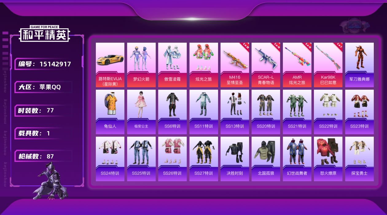 - [12951997]素材身法号【特价急出/详情看图】:苹果 手Q-3神装-4粉装-14特效枪-6载具-4粉色飞行器-3.6w热力值-4王牌印记-42套装-87枪皮【红色神装等级】:最终圣卫者-帕修斯(一级),辉羽雀灵-初翊(一级),圣域龙灵-瑞拉(一级)【热门品类】:套装-龟仙人【粉色载具】:宝马M4(圣保罗黄),炽龙极锋(暗夜黑),霜龙神御(云雾蓝),虚妄之影(炫耀紫),最终圣卫者摩托车,辉羽雀灵自行车【粉色套装】:粉装-幻彩电音,角色-狂魅哈莉,角色-宁雨蝶,角色-罗征【粉色枪皮等级】:AKM-幻海仙踪(四级),SCAR-L-青春物语(二级),M416-风花雪月(四级),AUG-圣斗士星矢(五级),Vector-最终圣卫者(三级),汤姆逊-热量炸弹(五级),Kar98K-圣域龙灵(一级),AWM-湮灭星辰(三级),Mk14-甜梦熊击(五级),Mk14-爆裂游戏(二级),DP-28-豹影疾电(五级),MG3-辉羽雀灵(三级),平底锅-喜羊羊与灰太狼(一级),烟雾弹-电雾迷城(三级)【粉色飞行器】:圣域金龙飞行器,雀灵庇佑飞行器,终晖之翼飞行器,宁雨蝶飞行器