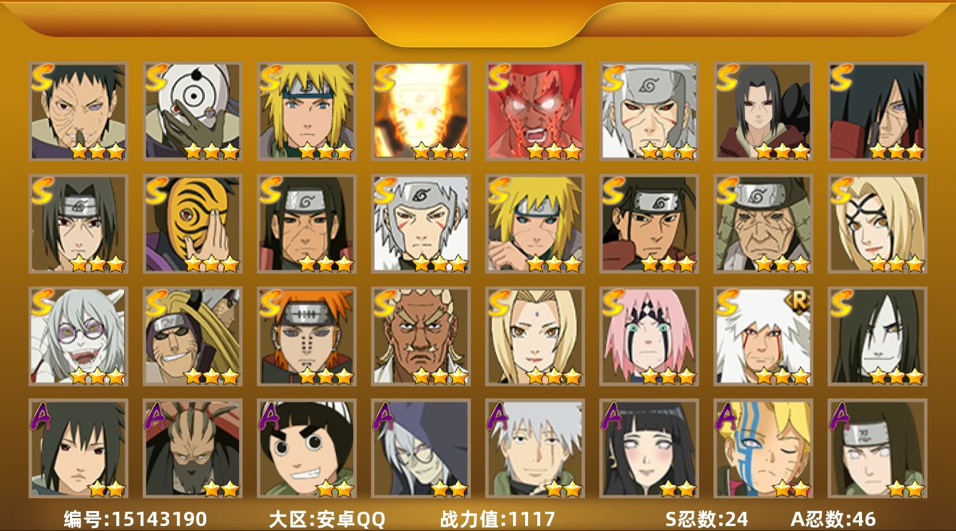 [15143190]V10/战力1117W/S忍24/A忍46 3星宇智波带土「忍界大战」,3星宇智波斑「白面具」,3星波风水门,3星漩涡鸣人「九喇嘛连结」,3星迈特凯「死门」,3星千手扉间「秽土转生」,3星宇智波鼬「秽土转生」,3星宇智波斑「秽土转生」,3星宇智波鼬「须佐能乎」,3星神秘面具男,3星千手柱间「秽土转生」,3星千手扉间,3星波风水门「秽土转生」,3星千手柱间,3星猿飞日斩「秽土转生」,3星纲手「百豪」,3星药师兜「仙人模式」,3星佩恩「天道」,3星艾「四代目雷影」,3星纲手,3星春野樱「忍界大战」,3星自来也「舞之豪杰」,3星金角·银角「秽土转生」,4星大蛇丸,4星我爱罗「疾风传」,2星迪达拉,5星蝎,5星迈特凯,5星猿飞阿斯玛,5星干柿鬼鲛,2星宇智波止水,2星小南,2星旗木卡卡西「万花筒写轮眼」,2星角都「地怨虞」,2星漩涡鸣人「仙人模式」,5星飞段,2星飞段「死司凭血」,2星日向宁次「忍界大战」,2星不缘,2星长十郎「六代目水影」,2星宇智波鼬,2星长门「青年」,2星艾「青年」,2星波风水门「青年」,2星奇拉比,2星宇智波佐助「万花筒写轮眼」,3星迪达拉「秽土转生」,2星漩涡鸣人「九尾查克拉」,2星宇智波佐助「须佐能乎」,2星宇智波止水「新春限定」,2星奇拉比「忍界大战」,2星千手扉间「漂泊武士」,2星大蛇丸「晓」,2星照美冥「五代目水影」,2星春野樱「百豪」,2星秋道丁次「忍界大战」,2星千代「近松十人卫」,2星我爱罗「忍界大战」,3星药师兜「半蛇斗篷」,2星漩涡博人「桃式显现」,2星日向雏田「最终章」,2星旗木卡卡西「幻之真容」,2星药师兜「侠影江湖」,2星李洛克「忍界大战」,2星宇智波泉奈,2星蝎「绯流琥」,2星桃地再不斩「秽土转生」