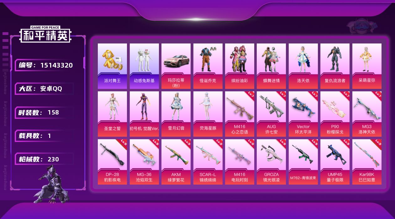 - [12809296]苹果 手Q-9粉装-9特效枪-1载具-1粉色飞行器-67343热力值-15王牌印记-146套装-209枪皮 【热门品类】:粉装-童趣迷兔,粉装-音爆索尼克,套装-浪漫天命,角色-2B战斗服款,套装-龟仙人,套装-暗影哥特 【粉色载具】:合金龙骨(蓝) 【粉色套装】:粉装-冰霜白皇,粉装-童趣迷兔,粉装-炙焰红王,粉装-音爆索尼克,粉装-第五大道,粉装-飒粉甜心,角色-呆萌星弥,角色-阿尔茜,角色-萨利娅 【粉色枪皮等级】:AKM-炫紫旋律(七级),SCAR-L-童趣迷兔(七级),SCAR-L-青春物语(一级),M416-五爪金龙(四级),M416-至情至圣(九级),M416-电玩时刻(五级),UMP45-相思残雪(七级),Kar98K-巳巳如意(五级),DP-28-豹影疾电(五级) 【粉色枪皮】:AKM-炫紫旋律,SCAR-L-童趣迷兔,SCAR-L-青春物语,M416-五爪金龙,M416-至情至圣,M416-电玩时刻,UMP45-相思残雪,Kar98K-巳巳如意,DP-28-豹影疾电 【粉色飞行器】:星之彼岸飞行器 【粉色降落伞】:未来战士降落伞,春暖花开降落伞,神秘黑猫降落伞,星之彼岸降落伞,蓝莓炮弹降落伞,筑梦精灵降落伞,垂柳戏鸭降落伞,第五大道降落伞,仲夏莫吉托降落伞,江南烟雨降落伞,冷漠罗丽降落伞 【稀有套装】:套装-龟仙人,角色-达芬奇,套装-霓虹热舞,套装-彩虹兔,套装-云朵鹅,套装-雪绒豹,套装-蜜露汐语,套装-朱霞炽焰,套装-凌霄紫焰,套装-擎苍青焰,玩偶服-喜羊羊 【稀有枪皮】:AKM-2P战斗服款,AKM-冰凉西瓜,AKM-彩虹符号,AKM-星之彼岸,AKM-破晓战魂,AKM-缤纷海域,AKM-霓虹街区,AKM-龙的传人,M16A4-幻世战舞者,M16A4-甜心亚梦,SCAR-L-夜灯,SCAR-L-玉兔迎春,SCAR-L-黄金龙骨,M416-糯团青竹,M416-红色方程式,GROZA-异彩先驱,GROZA-懵萌河马,GROZA-田园牧歌,GROZA-荧海星豚,AUG-2P战斗服款,AUG-天降萌叽,QBZ-彩虹符号,QBZ-飞驰魅影,M762-天降萌叽,M762-瑞龙福将,M762-云朵鹅,Mk47-妙红点点,G36C-镜域双华,G36C-懵萌河马,G36C-炙焰牛王,G36C-星穹咏叹调,AC-VAL-天降萌叽,AC-VAL-快闪甜心,A