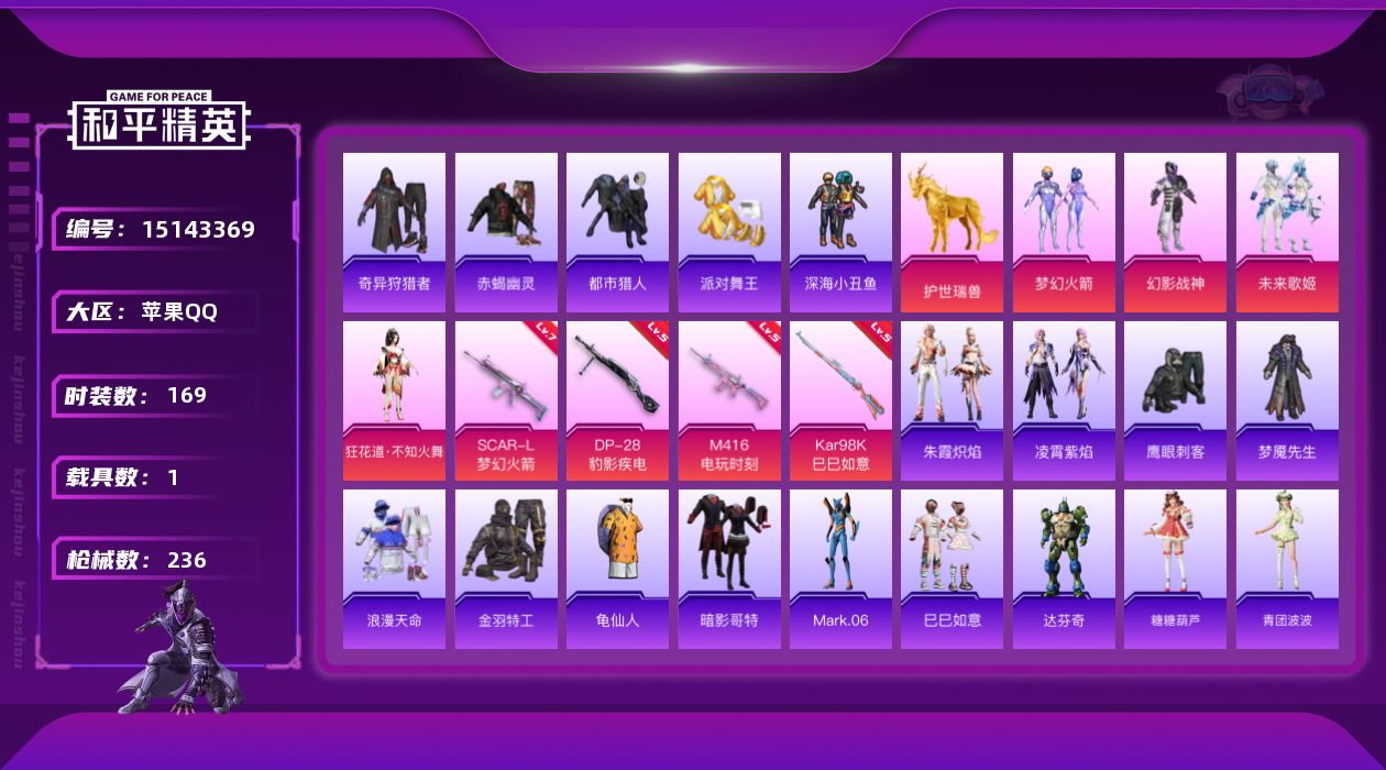 [15143369]【店主推荐捡漏号!可直接换绑】/素材身法号 苹果 手Q-4粉装-4特效枪-1载具-3粉色飞行器-6.9w热力值-18王牌印记-169套装-236枪皮【热门品类】:粉装-梦幻火箭,套装-浪漫天命,套装-赤蝎幽灵,套装-都市猎人,套装-派对舞王,套装-深海小丑鱼,套装-奇异狩猎者,套装-金羽特工,套装-龟仙人,套装-暗影哥特,角色-Mark.06【粉色载具】:护世瑞兽【粉色套装】:粉装-幻影战神,粉装-梦幻火箭,粉装-未来歌姬,角色-狂花道·不知火舞【粉色枪皮等级】:SCAR-L-梦幻火箭(七级),M416-电玩时刻(五级),Kar98K-巳巳如意(五级),DP-28-豹影疾电(五级)【粉色飞行器】:梦幻火箭飞行器,神秘黑猫飞行器,万象金身飞行器