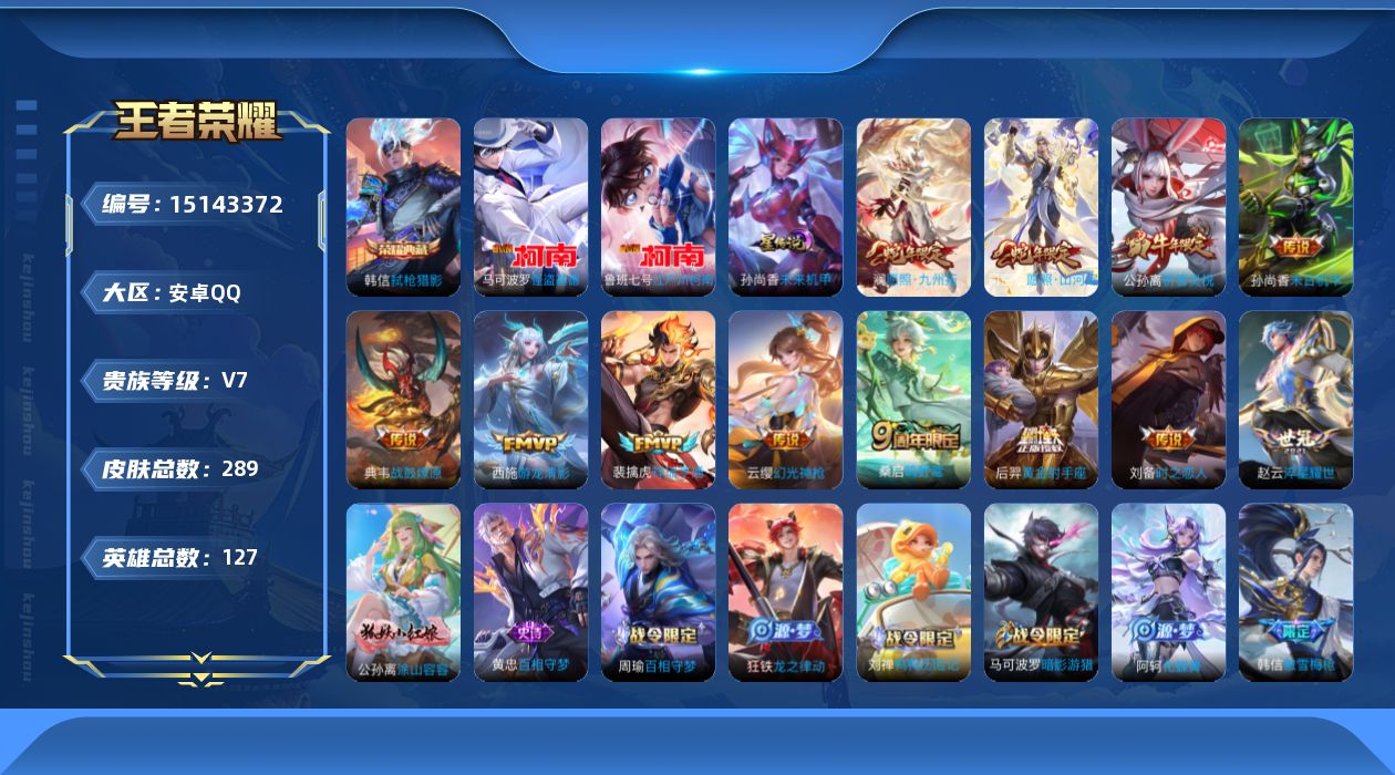 - [12229522]V8 1典藏 25传说 126英雄 258皮肤 可修改实名 优质装备:弑枪猎影(韩信典藏),云鹰飞将(小将军),炽阳神光,一念神魔,仲夏夜之梦(大飞蛾),零号·赤焰,胖达荣荣,时之恋人-刘备(电焊工),游龙清影(小青龙),无双飞将,鹤归松栖(云缨),惊梅引,霜月吟,澜逐花归海,涂山容容 传说皮:死亡执政官,九山相柳,云诺千山,祥瑞亨通,幻光神枪 珍宝阁皮:女武神,玩趣恶龙 限定皮:愿照·九州拓(澜年限),愿照·山河定(司空震年限),愿照·千秋盛(女娲年限),鸣野蒿,至尊宝,白虎志(电光耗子),高山流水,五谷丰年,梁祝,逐梦之星,默契交锋-花木兰,时之祈愿-云中君,深海之息(深海大菠萝),神器·万象笔 史诗皮:鸭鸭历险记-刘禅,绮世丹青,化蝶舞,龙之律动,石田雨龙,百相守梦-周瑜,茶境仙,百相守梦-黄忠,埋骨钱,谪仙醉月,星界特工,破空之剑,东方月初,芈月浮光幕影,海诺心动手记,百相守梦-百里守约,黄金分割率,特工魅影,千年之狐,鹤归松栖(赵怀真),江河有灵,百解令(蒙犽),百相守梦(刘备),末日机甲-吕布,猫狗日记-孙策,乱世虎臣,节奏热浪,女仆咖啡,摇滚巨星,水果甜心,绅士熊喵,天才门将,星夜王子,心灵骇客,功夫厨神,德古拉伯爵,暗隐猎兽者,幽灵船长,鬼剑武藏,暗渊魔法,心灵战警,乐园奇幻夜,天秀·启明,舞动绿茵,地狱岩魂,纤云弄巧,拒霜思,缤纷独角兽,乘风破浪,逐浪之夏,月团寄思,水晶猎龙者,曙光守护者,箭羽风息,金属风暴,圣诞狂欢,圣诞恋歌,鹰眼统帅,暗夜贵公子,魅力维加斯,赏金猎手,无心,未来纪元-赵云