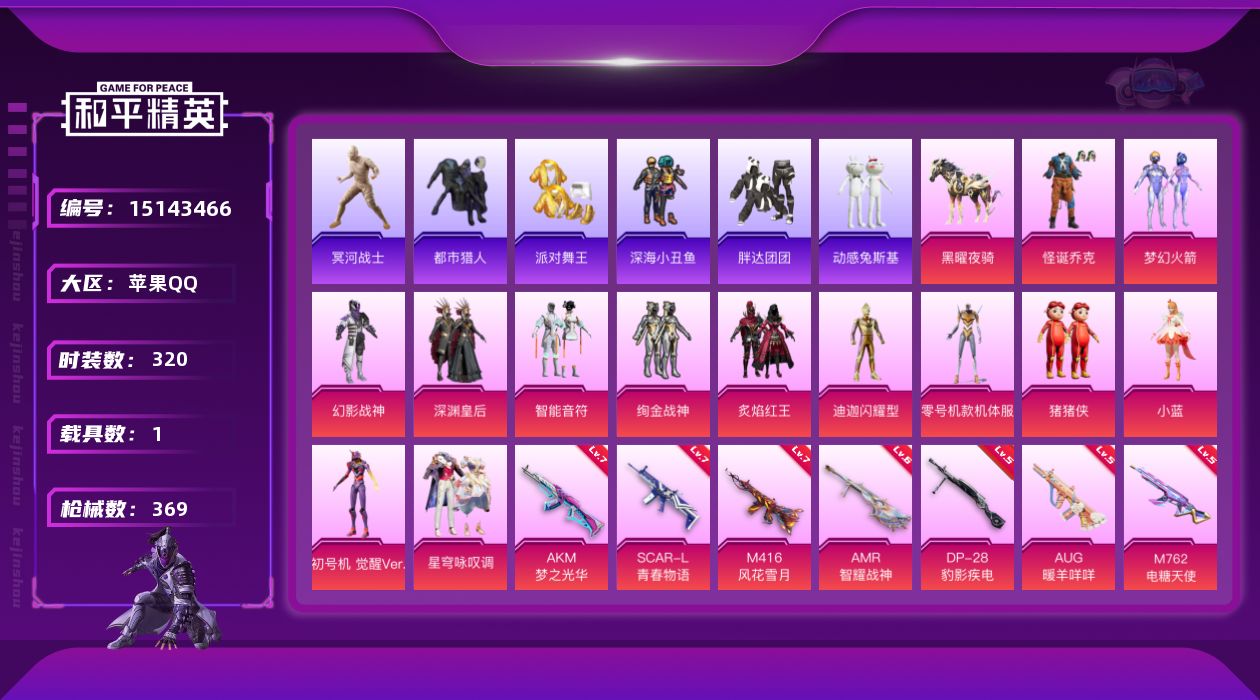 - [12878232]素材身法号/无敌战神框1 苹果 手Q-无敌战神框-6粉装-4特效枪-1载具-2粉色飞行器-6.9w热力值-16王牌印记-167套装-230枪皮【热门品类】:绝对防御上衣,套装-浪漫天命,套装-都市猎人,套装-深海小丑鱼,套装-小丑鱼,套装-奇异狩猎者,套装-龟仙人,套装-暗影哥特,角色-8号机,角色-Mark.06【粉色载具】:合金龙骨(绿)【粉色套装】:粉装-幻影战神,粉装-宝贝奶油派,粉装-天使彩虹糖,角色-复仇流浪者,粉装-仲夏莫吉托,粉装-莲影清波【粉色枪皮等级】:AKM-甜心宝贝(七级),M416-风花雪月(六级),Kar98K-巳巳如意(五级),平底锅-仲夏莫吉托(五级)【粉色飞行器】:太空嘟嘟飞行器,黄族统领飞行器