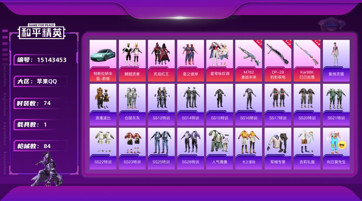 [15143453]可二次【店主推荐捡漏号!可直接换绑】 苹果 手Q-4粉装-3特效枪-1载具-1粉色飞行器-3.1w热力值-5王牌印记-74套装-84枪皮【热门品类】:套装-浪漫波比【粉色载具】:特斯拉Roadster(水滴蓝)【粉色套装】:粉装-鳞翅贤者,粉装-炙焰红王,粉装-星之彼岸,粉装-星穹咏叹调【粉色枪皮等级】:M762-激战未来(七级),Kar98K-巳巳如意(三级),DP-28-豹影疾电(三级)【粉色飞行器】:梦幻火箭飞行器
