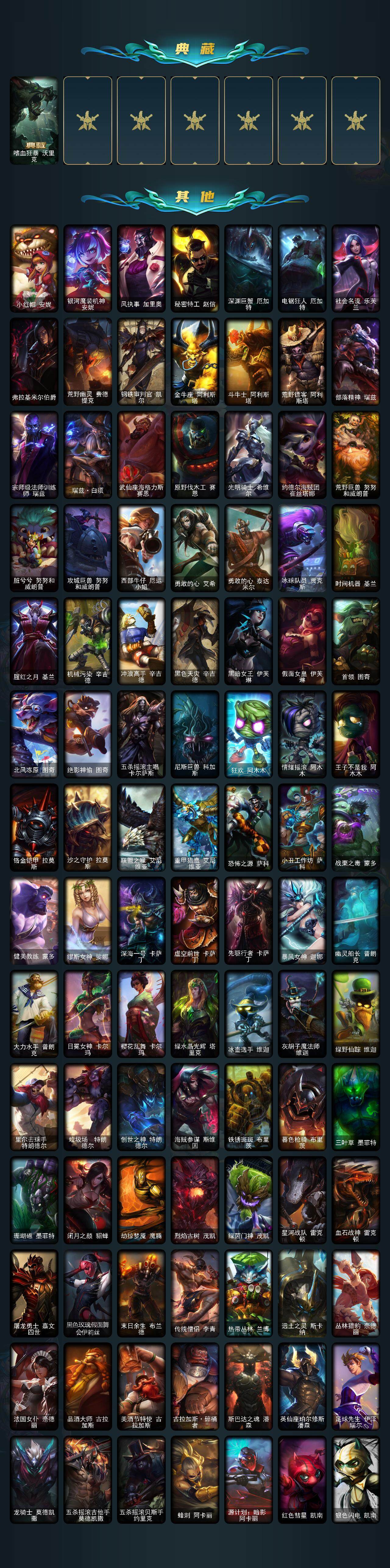 【传说皮肤】:地狱之门卫士加里奥,魔幻卡牌崔斯特,战地机甲厄加特,大天使长米迦勒凯尔,提莫约德尔人的一大步,约德尔国队长提莫,烈焰雄心崔丝塔娜,合金巨兽努努和威朗普,女皇艾希,鬼魂新娘莫甘娜,绅士科加斯,律政大亨蒙多,女主播迦娜,第三类接触黑默丁格,枯萎之壤泽拉斯,黯黑魔龙希瓦娜,冰霜亚龙希瓦娜,焰尾妖狐阿狸,光明哨兵格雷福斯,女校长菲奥娜,西部魔影卢锡安,天煞劫,源计划毁灭派克