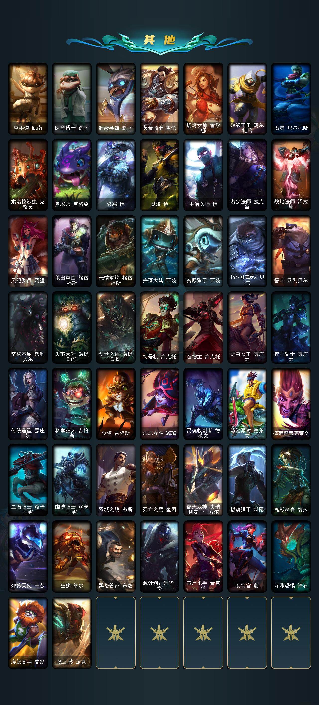 【史诗皮肤】:皇家火枪手崔斯特,摄魂男爵弗拉基米尔,铁钩船长费德提克,天人合一易,侍魂易,地狱火阿利斯塔,战场公主希维尔,钢铁之心希维尔,圣洁化身索拉卡,兔宝宝提莫,火箭达人崔丝塔娜,女船长厄运小姐,国王泰达米尔,百夫长贾克斯,黑色荆棘莫甘娜,炼金狂士辛吉德,死神卡尔萨斯,侏罗纪化石科加斯,小小骑士阿木木,殇之机器人阿木木,贵族血统萨科,飞越疯人院萨科,武动巅峰萨科,战争血统蒙多,五杀摇滚键盘手娑娜,夜行义贼艾瑞莉娅,海克斯科技迦娜,恐惧新星普朗克,血石诅咒塔里克,穿着正装的恶魔维迦,北领前线斯维因,绝代智将斯维因,驯龙大师斯维因,抵抗军天使