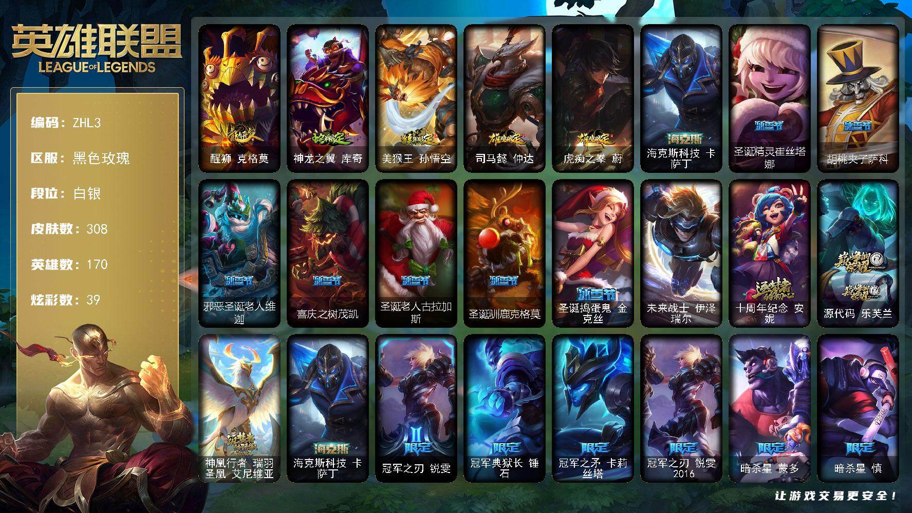 [15144219]可直接换绑!白银段位-170英雄-308皮肤-39炫彩-1终极-4神话-42限定-23传说-81史诗 【热门头像】:爱意绵绵头像 【臻彩皮肤】:冠军之刃锐雯2016凯旋圣装,冠军之矛卡莉丝塔凯旋圣装,星之守护者萨勒芬妮未来之光 【年限皮肤】:醒狮克格莫,神龙之翼库奇,美猴王孙悟空,司马懿仲达,虎痴之拳蔚 【海克斯皮肤】:海克斯科技卡萨丁 【冰雪限定】:圣诞精灵崔丝塔娜,胡桃夹子萨科,邪恶圣诞老人维迦,喜庆之树茂凯,圣诞老人古拉加斯,圣诞驯鹿克格莫,圣诞捣蛋鬼金克丝 【终极皮肤】:未来战士伊泽瑞尔 【神话皮肤】:十周年纪念安妮,源代码乐芙兰,神凰行者瑞羽圣凰艾尼维亚,海克斯科技卡萨丁 【限定皮肤】:冠军之刃锐雯,冠军典狱长锤石,冠军之矛卡莉丝塔,冠军之刃锐雯2016,暗杀星蒙多,暗杀星慎,SSW辛吉德,SKTT1阿兹尔,SKTT1卡莉丝塔,SKTT1辛德拉,iG卡莎,胜利女神奥莉安娜,胜利之剑亚托克斯,胜利枪神卢锡安,胜利机器人布里茨,胜利之运崔斯特,南瓜头费德提克,鬼影重重魔腾,鬼影森森茂凯,外星装甲库奇,暗影沃里克,野兽猎人德莱文,野兽猎人瑟庄妮,波比的巧克力工坊,都铎王朝图奇,御星魔矢艾希,钢铁之翼艾尼维亚,征服者诺提勒斯,防暴天使凯尔,克格汪 【传说皮肤】:地狱之门卫士加里奥,魔幻卡牌崔斯特,战地机甲厄加特,大天使长米迦勒凯尔,提莫约德尔人的一大步,约德尔国队长提莫,烈焰雄心崔丝塔娜,合金巨兽努努和威朗普,女皇艾希,鬼魂新娘莫甘娜,绅士科加斯,律政大亨蒙多,女主播迦娜,第三类接触黑默丁格,枯萎之壤泽拉斯,黯黑魔龙希瓦娜,冰霜亚龙希瓦娜,焰尾妖狐阿狸,光明哨兵格雷福斯,女校长菲奥娜,西部魔影卢锡安,天煞劫,源计划毁灭派克 【史诗皮肤】:皇家火枪手崔斯特,摄魂男爵弗拉基米尔,铁钩船长费德提克,天人合一易,侍魂易,地狱火阿利斯塔,战场公主希维尔,钢铁之心希维尔,圣洁化身索拉卡,兔宝宝提莫,火箭达人崔丝塔娜,女船长厄运小姐,国王泰达米尔,百夫长贾克斯,黑色荆棘莫甘娜,炼金狂士辛吉德,死神卡尔萨斯,侏罗纪化石科加斯,小小骑士阿木木,殇之机器人阿木木,贵族血统萨科,飞越疯人院萨科,武动巅峰萨科,战争血统蒙多,五杀摇滚键盘手娑娜,夜行义贼艾瑞莉娅,海克斯科技迦娜,恐惧新星普朗克,血石诅咒塔里克,穿着正装的恶魔维迦,北领前线斯维因,绝代智将斯维因,驯龙大师斯维因,抵抗军天使