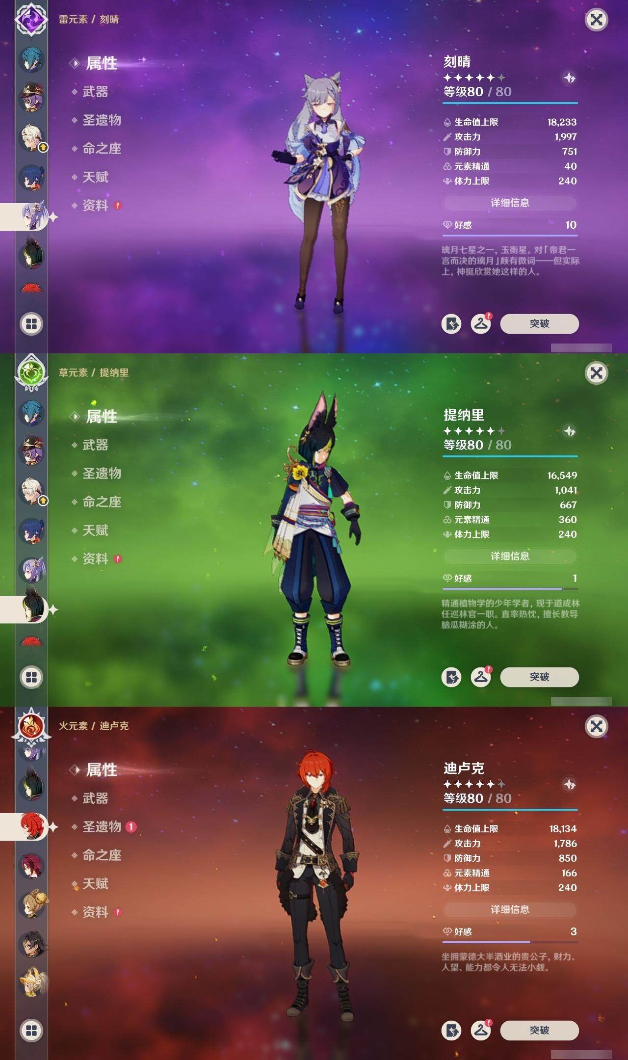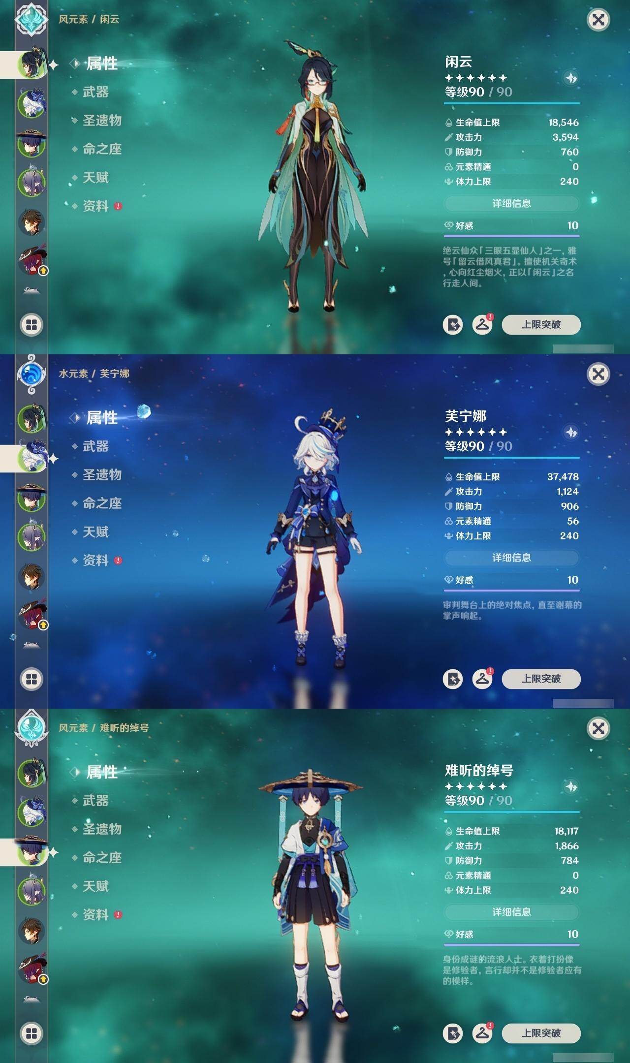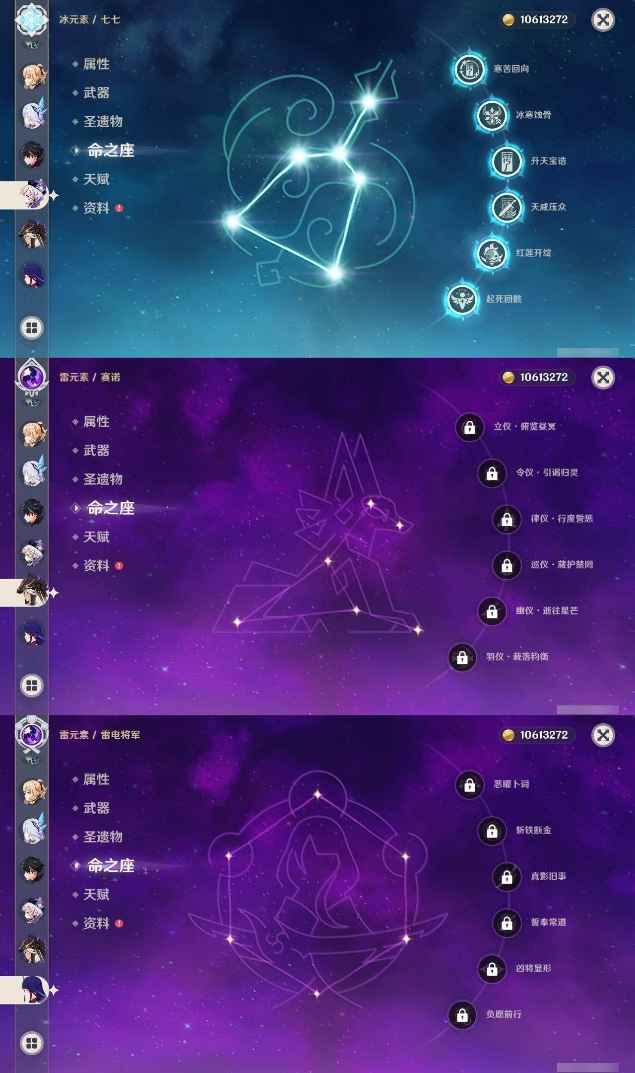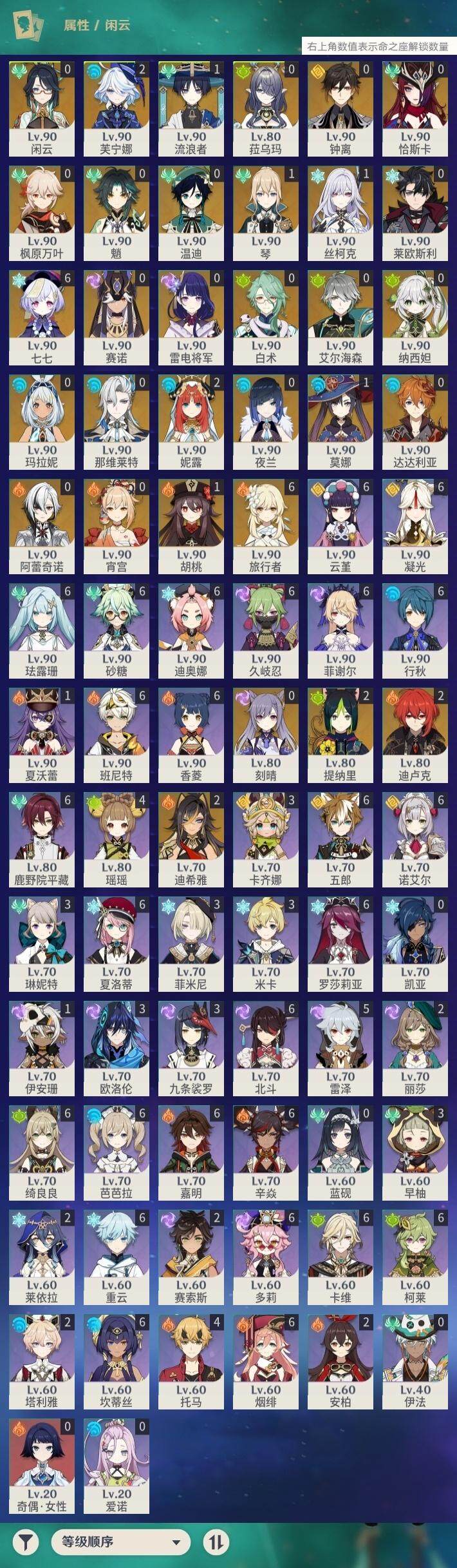 0命阿蕾奇诺,0命闲云,2命芙宁娜,0命莱欧斯利,0命那维莱特,0命白术,2命迪希雅,0命艾尔海森,1命流浪者,0命纳西妲,2命妮露,0命赛诺,2命提纳里,0命夜兰,0命雷电将军,0命枫原万叶,0命钟离,1命胡桃,0命魈,0命宵宫,0命温迪,0命达达利亚,0命刻晴,满命七七,1命琴,1命莫娜,2命迪卢克,0命玛拉妮,0命恰斯卡,1命丝柯克,0命菈乌玛,精1万世流涌大典,精1图莱杜拉的回忆,精1圣显之钥,精1若水,精1息灾,精1飞雷之弦振,精1雾切之回光,精1苍古自由之誓,精1四风原典,精1和璞鸢,精1天空之脊,精2天空之卷,精1星鹫赤羽